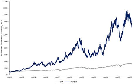 To illustrate the historical impact of the implicit financing cost on the performance of the S&P 500 Futures Excess Return Index, the following graph sets forth a comparison of the historical performance of the S&P 500 Futures Excess Return Index against the historical performance of the S&P 500® Index from January 4, 2016 through March 24, 2026, each normalized to have a closing value of 100.00 on January 4, 2016 to facilitate a comparison. The performance of the S&P 500® Index shown below is its price return performance – i.e., its performance without reflecting dividends. The total return performance of the S&P 500® Index (i.e., its performance reflecting dividends) would be greater than the price return performance shown below.