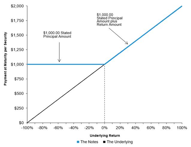 | ▪ | If, on any valuation date prior to the final valuation date, the closing value of the underlying is greater than or equal to the applicable premium threshold value, the notes will be automatically redeemed. If the notes are not automatically redeemed prior to maturity and the underlying appreciates from the initial underlying value to the final underlying value, you will receive a positive return at maturity equal to that appreciation multiplied by the upside participation rate specified below. However, if the notes are not automatically redeemed prior to maturity and the underlying remains the same or depreciates, you will be repaid the stated principal amount of your notes at maturity but will not receive any return on your investment. |