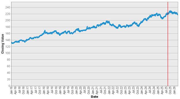 The closing value of the S&P 500 Futures 7% Intraday Edge Volatility TCA 2% Decrement Index (USD) ER on March 24, 2026 was 217.27. The graph below shows the hypothetical back-tested closing values of the S&P 500 Futures 7% Intraday Edge Volatility TCA 2% Decrement Index (USD) ER for the period from January 4, 2016 to August 13, 2025, and historical closing values of the S&P 500 Futures 7% Intraday Edge Volatility TCA 2% Decrement Index (USD) ER for the period from August 14, 2025 to March 24, 2026. All data to the left of the vertical red line in the graph below are hypothetical and back-tested. We obtained the closing values from