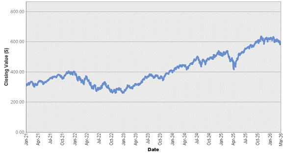 The graph below shows the closing value of the Invesco QQQ TrustSM, Series 1 for each day such value was available from January 4, 2021 to March 25, 2026. We obtained the closing values from Bloomberg L.P., without independent verification. You should not take historical closing values as an indication of future performance.