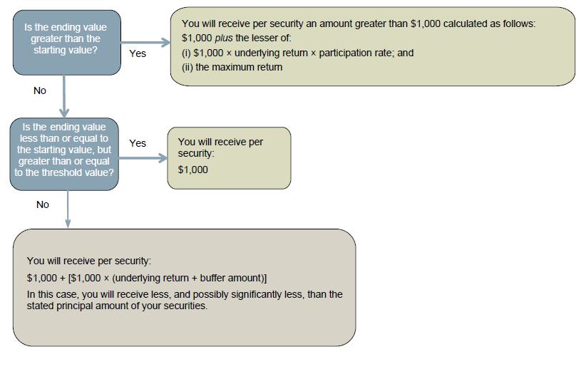 For each $1,000 stated principal amount security you hold at maturity: • If the ending value is greater than the starting value: $1,000 plus the lesser of: (i) $1,000 × underlying return × participation rate; and (ii) the maximum return • If the ending value is less than or equal to the starting value, but greater than or equal to the threshold value: $1,000; or • If the ending value is less than the threshold value: $1,000 + [$1,000 × (underlying return + buffer amount)] If the ending value is less than the threshold value, you will have 1-to-1 downside exposure to the decrease in the value of the underlying in excess of the buffer amount and will lose some, and possibly up to 90%, of the stated principal amount of your securities at maturity. |