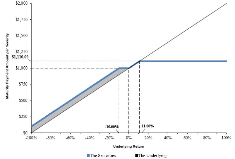 | n | Unlike ordinary debt securities, the securities do not pay interest or repay a fixed amount of principal at maturity. Instead, the securities provide for a maturity payment amount that may be greater than, equal to or less than the stated principal amount of the securities, depending on the performance of the underlying from the starting value to the ending value, subject to the maximum return. The maturity payment amount will reflect the following terms: |