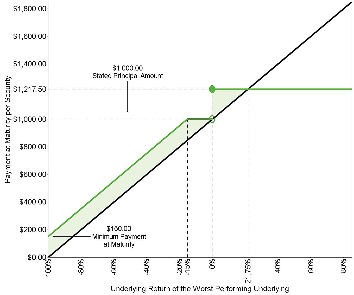 The diagram below illustrates your payment at maturity of the securities, assuming the securities have not previously been automatically redeemed, for a range of hypothetical underlying returns of the worst performing underlying on the final valuation date. Your payment at maturity (if the securities are not earlier automatically redeemed) will be determined based solely on the performance of the worst performing underlying on the final valuation date.