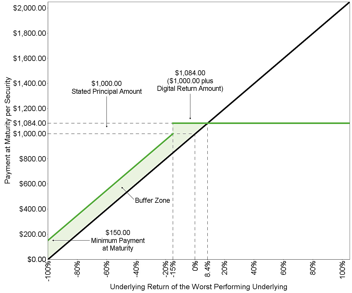 ▪The securities offer modified exposure to the performance of the worst performing underlying, with (i) a digital (fixed) return at maturity so long as the final underlying value of the worst performing underlying is greater than or equal to its final buffer value and (ii) if the final underlying value of the worst performing underlying is less than its final buffer value, a limited buffer against the depreciation of the worst performing underlying as described below. In exchange for these features, investors in the securities must be willing to forgo (i) any appreciation of the worst performing underlying in excess of the digital return and (ii) any dividends with respect to any underlying. In addition, investors in the securities must be willing to accept downside exposure to any depreciation of the worst performing underlying in excess of the buffer percentage specified below. If the worst performing underlying depreciates by more than the buffer percentage from its initial underlying value to its final underlying value, you will lose 1% of the stated principal amount of your securities for every 1% by which that depreciation exceeds the buffer percentage.