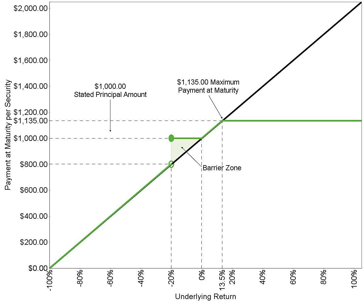 You will receive at maturity for each security you then hold: ■If the final underlying value is greater than the initial underlying value: $1,000 + the return amount, subject to the maximum return at maturity ■If the final underlying value is less than or equal to the initial underlying value but greater than or equal to the final barrier value: $1,000 ■If the final underlying value is less than the final barrier value: $1,000 + ($1,000 × the underlying return) If the final underlying value is less than the final barrier value, you will receive significantly less than the stated principal amount of your securities, and possibly nothing, at maturity. |