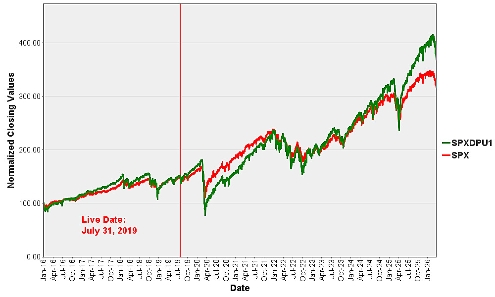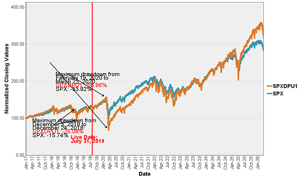 In the graph below, references to “SPXDPU1” are to the S&P 500 Dynamic Participation Index and references to “SPX” are to the S&P 500® Index.