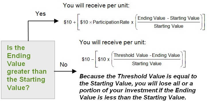The following table and examples are for purposes of illustration only. They are based on hypothetical values and show hypothetical returns on the notes. They illustrate the calculation of the Redemption Amount and total rate of return based on a hypothetical Starting Value of 100.00, a hypothetical Threshold Value of 100.00, a hypothetical Participation Rate of 175.00% and a range of hypothetical Ending Values. The actual amount you receive and the resulting total rate of return will depend on the actual Starting Value, Threshold Value, Participation Rate, Ending Value and whether you hold the notes to maturity. The following examples do not take into account any tax consequences from investing in the notes.