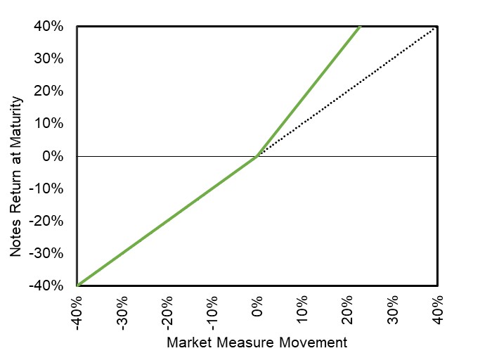 This graph reflects the returns on the notes, based on a hypothetical Participation Rate of 175.00% (the midpoint of the Participation Rate range of [165.00% to 185.00%]) and the Threshold Value of 100.00% of the Starting Value. The green line reflects the returns on the notes, while the dotted gray line reflects the returns of a direct investment in the stocks included in the Index, excluding dividends. This graph has been prepared for purposes of illustration only. |