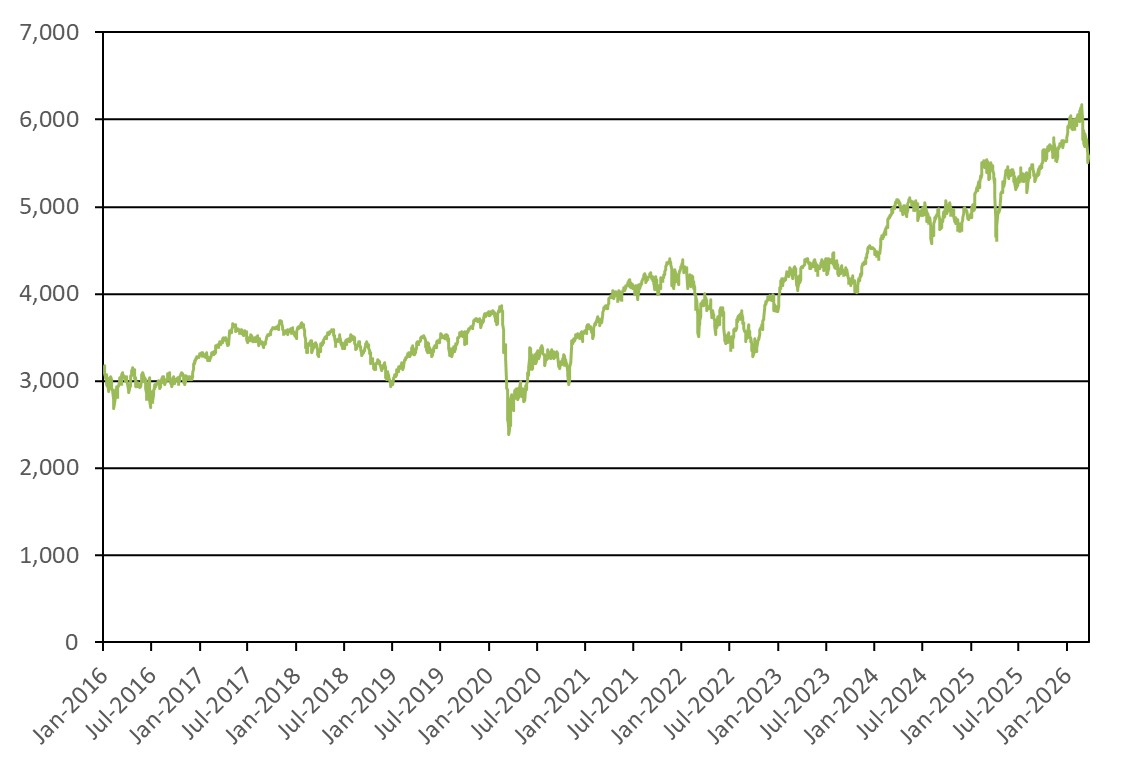 The following graph shows the daily historical performance of the Index in the period from January 1, 2016 through March 25, 2026. We obtained this historical data from Bloomberg L.P. We have not independently verified the accuracy or completeness of the information obtained from Bloomberg L.P. On March 25, 2026, the closing level of the Index was 5,649.33.