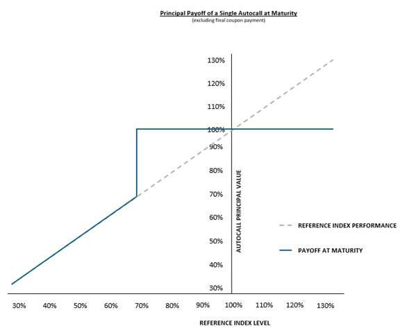 | ◾ | Contingent Principal Protection: If an Autocallable is not called prior to its stated maturity, its principal is fully protected if its underlying reference index is at or above the Principal Barrier. If the underlying reference index is below the Principal Barrier, principal loss for that Autocallable will be equivalent to the negative performance of the underlying reference index. |