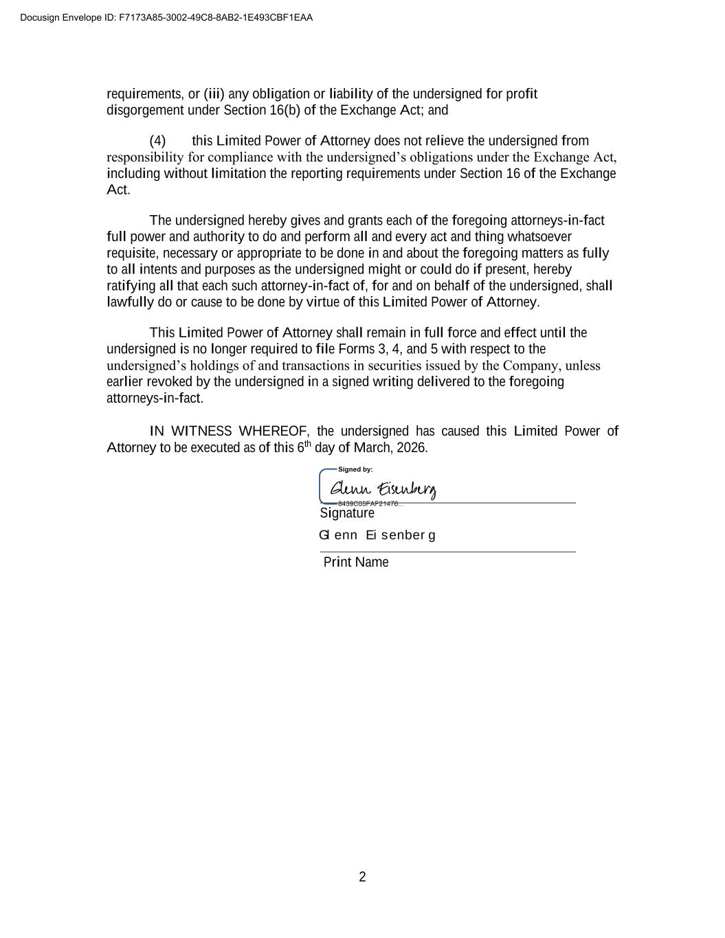2 requirements, or (iii) any obligation or liability of the undersigned for profit disgorgement under Section 16(b) of the Exchange Act; and (4) this Limited Power of Attorney does not relieve the undersigned from responsibility for compliance with the undersigned’s obligations under the Exchange Act, including without limitation the reporting requirements under Section 16 of the Exchange Act. The undersigned hereby gives and grants each of the foregoing attorneys-in-fact full power and authority to do and perform all and every act and thing whatsoever requisite, necessary or appropriate to be done in and about the foregoing matters as fully to all intents and purposes as the undersigned might or could do if present, hereby ratifying all that each such attorney-in-fact of, for and on behalf of the undersigned, shall lawfully do or cause to be done by virtue of this Limited Power of Attorney. This Limited Power of Attorney shall remain in full force and effect until the undersigned is no longer required to file Forms 3, 4, and 5 with respect to the undersigned’s holdings of and transactions in securities issued by the Company, unless earlier revoked by the undersigned in a signed writing delivered to the foregoing attorneys-in-fact. IN WITNESS WHEREOF, the undersigned has caused this Limited Power of Attorney to be executed as of this 6th day of March, 2026. Signature Print Name Docusign Envelope ID: F7173A85-3002-49C8-8AB2-1E493CBF1EAA Glenn Eisenberg