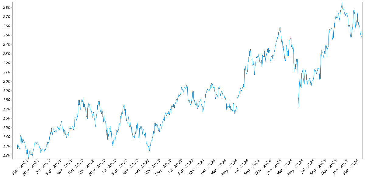 The following graph sets forth the daily historical performance of AAPL in the period from January 2, 2021 through the pricing date. We obtained this historical data from Bloomberg L.P. We have not independently verified the accuracy or completeness of the information obtained from Bloomberg L.P. The Closing Market Prices reflected in the graph below may have been adjusted to reflect certain corporate actions, such as stock splits and reverse stock splits. On the pricing date, the Closing Market Price of AAPL was $252.89.