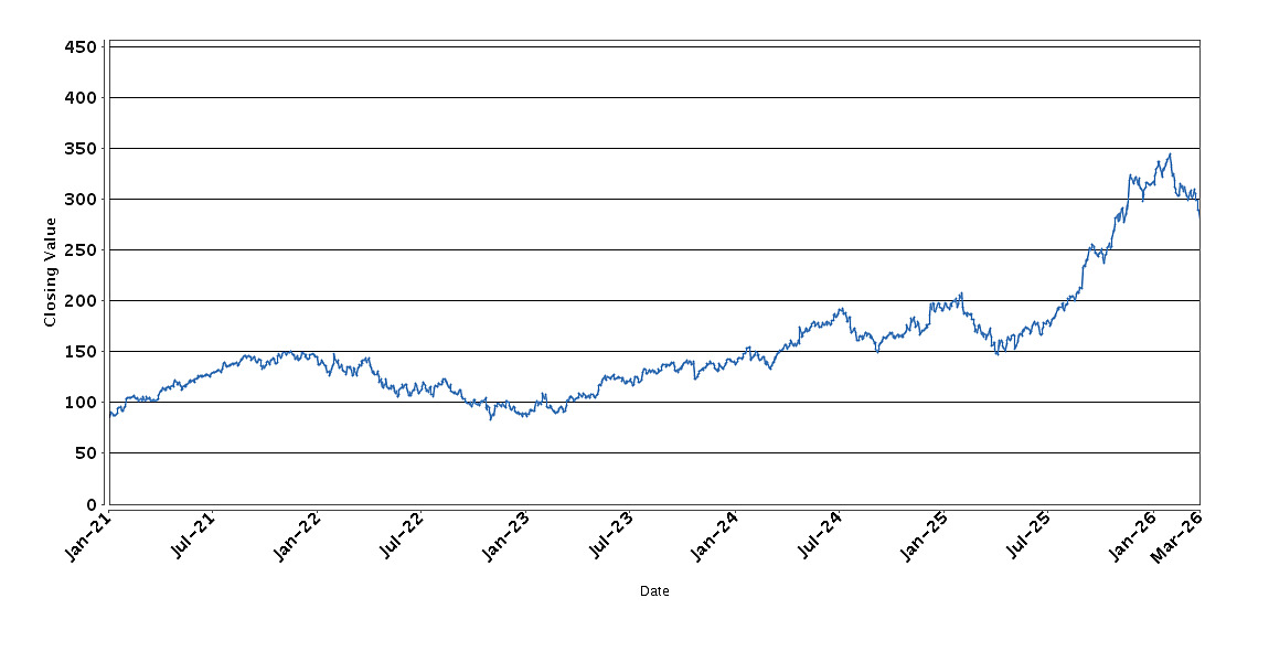 The graph below sets forth the historical performance of Alphabet Inc. based on the daily Closing Value from January 4, 2021 through March 26, 2026. We obtained the Closing Values shown in the graph below from Bloomberg. We have not independently verified the accuracy or completeness of the information obtained from Bloomberg. These historical closing values may have been adjusted to reflect certain corporate actions such as stock splits and reverse stock splits.