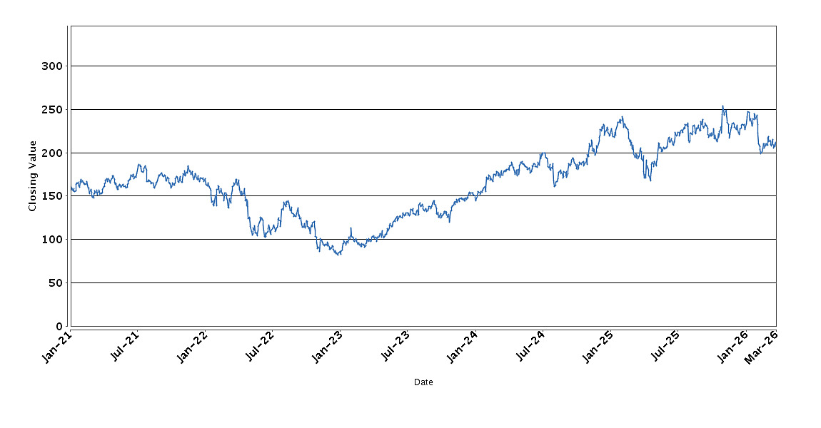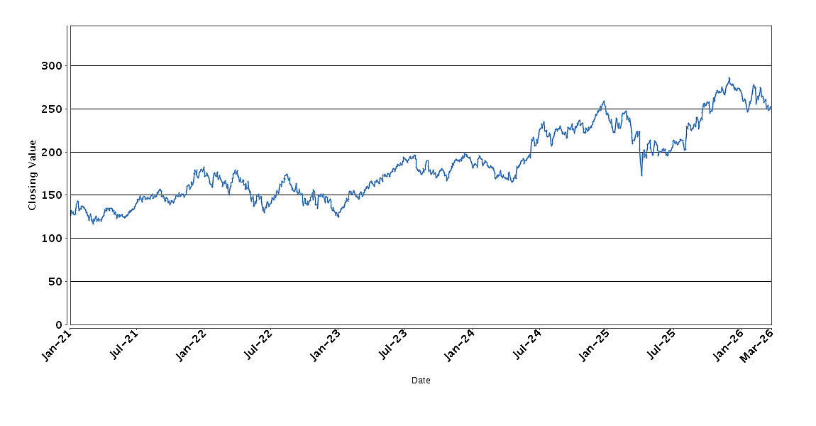 The graph below sets forth the historical performance of Apple Inc. based on the daily Closing Value from January 4, 2021 through March 26, 2026. We obtained the Closing Values shown in the graph below from Bloomberg. We have not independently verified the accuracy or completeness of the information obtained from Bloomberg. These historical closing values may have been adjusted to reflect certain corporate actions such as stock splits and reverse stock splits.