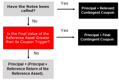 If the Notes are not called and the Final Value of the Reference Asset is greater than or equal to its Coupon Trigger, you will receive a Payment at Maturity equal to 100% of the Principal Amount plus the final Contingent Coupon.