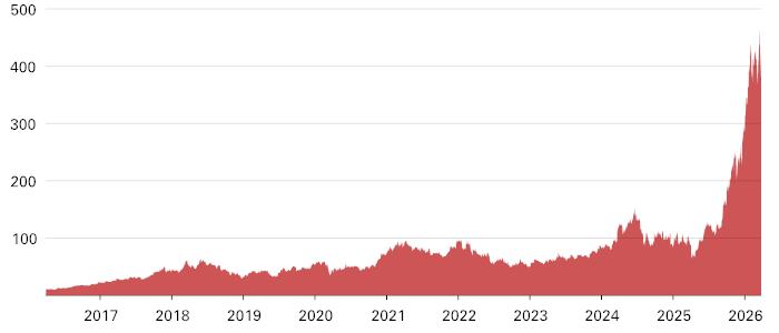 The following graph sets forth the historical performance of MU based on the daily historical closing values from March 29, 2016 through March 27, 2026. We obtained the closing values below from the Bloomberg Professional® service. We have not undertaken any independent review of, or made any due diligence inquiry with respect to, the information obtained from the Bloomberg Professional® service.![]() |