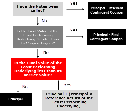 If the Notes are not automatically called and the Final Value of the Least Performing Underlying is greater than or equal to its Coupon Trigger, you will receive a Payment at Maturity equal to 100% of the Principal Amount plus the final Contingent Coupon.