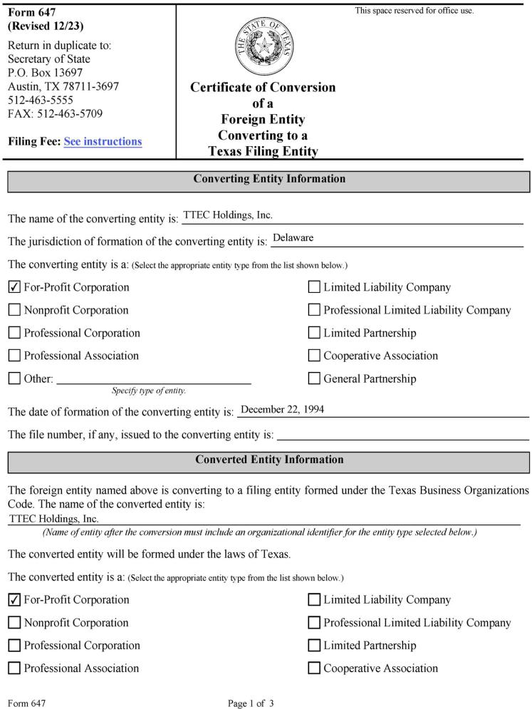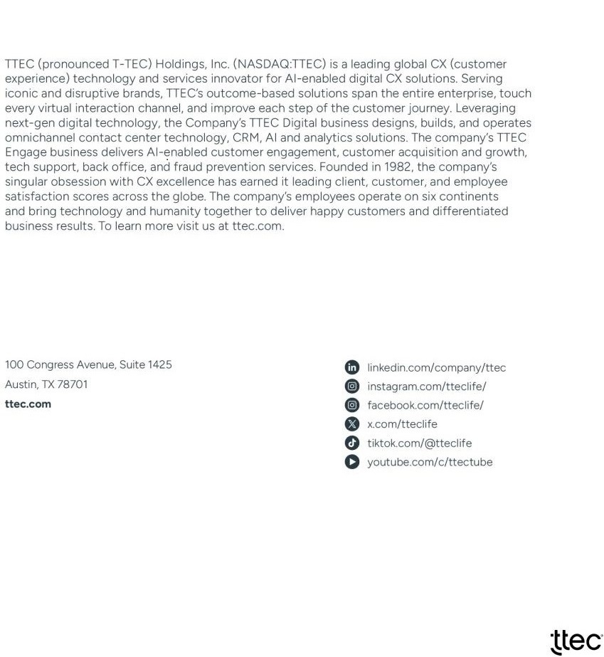 Signature [PLEASE SIGN WITHIN BOX] Date Signature (Joint Owners) Date TO VOTE, MARK BLOCKS BELOW IN BLUE OR BLACK INK AS FOLLOWS: KEEP THIS PORTION FOR YOUR RECORDS DETACH AND RETURN THIS PORTION ONLY THIS PROXY CARD IS VALID ONLY WHEN SIGNED AND DATED. PRELIMINARY PROXY CARD – SUBJECT TO COMPLETION V87030-P51454 For Against Abstain ! ! ! ! ! ! ! ! ! ! ! ! ! ! ! ! ! ! ! ! 100 CONGRESS AVENUE, SUITE 1425 AUSTIN, TX 78701 VOTE BY INTERNET Before The Meeting - Go to www.proxyvote.com or scan the QR Barcode above Use the Internet to transmit your voting instructions and for electronic delivery of information up until 11:59 p.m., Eastern Daylight Time, on May 20, 2026. Have your proxy card in hand when you access the website and follow the instructions to obtain your records and to create an electronic voting instruction form. During The Meeting - Go to www.virtualshareholdermeeting.com/TTEC2026 You may attend the meeting via the Internet and vote during the meeting. Have the information that is printed in the box marked by the arrow available and follow the instructions. VOTE BY PHONE - 1-800-690-6903 Use any touch-tone telephone to transmit your voting instructions up until 11:59 p.m., Eastern Daylight Time, on May 20, 2026. Have your proxy card in hand when you call and then follow the instructions. VOTE BY MAIL Mark, sign and date your proxy card and return it in the postage-paid envelope we have provided or return it to Vote Processing, c/o Broadridge, 51 Mercedes Way, Edgewood, NY 11717. TTEC HOLDINGS, INC. 1. Election of Director Nominees The Board of Directors recommends you vote FOR the following: 1a. Kenneth D. Tuchman 1b. Steven J. Anenen 1c. Tracy L. Bahl 1d. Gregory A. Conley 1e. Robert N. Frerichs 1f. Marc L. Holtzman 1g. Gina L. Loften For Withhold NOTE: This proxy, when properly executed, will be voted in the manner directed herein. If no direction is made, the proxy will be voted FOR all of the Board of Directors' nominees and FOR Proposals 2, 3 and 4. NOTE: Such other business as may properly come before the meeting or any adjournment thereof. 2. The ratification of the appointment of PricewaterhouseCoopers LLP as our independent registered public accounting firm for fiscal year 2026. 3. The approval, on a non-binding, advisory basis, of the compensation of our named executive officers, as disclosed in the Proxy Statement. 4. The approval of the redomestication of the Company from Delaware to Texas by conversion. Please sign exactly as your name(s) appear(s) hereon. When signing as attorney, executor, administrator, or other fiduciary, please give full title as such. Joint owners should each sign personally. All holders must sign. If a corporation or partnership, please sign in full corporate or partnership name by authorized officer. ! ! ! SCAN TO VIEW MATERIALS & VOTEw