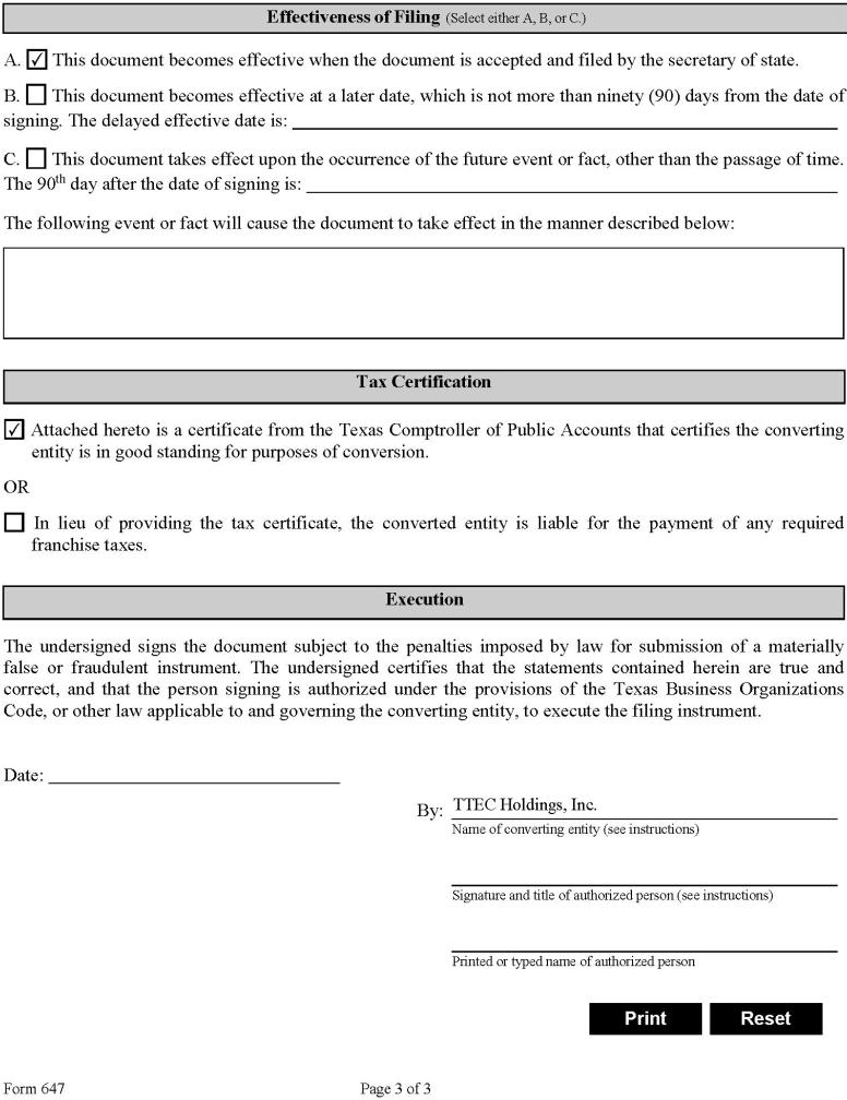 4. Governance of the Converted Entity. On and after the Effective Time, the affairs of the Converted Entity shall be governed in accordance with the TBOC and the Certificate of Formation, and the Bylaws of the Converted Entity in substantially the form attached hereto as Exhibit B. Immediately after the Effective Time, the directors and officers of the Converting Entity shall continue as the directors and officers of the Converted Entity.