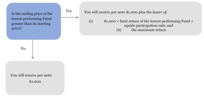principal amount of the notes, depending on the performance of the lowest performing Fund from its starting price to its ending price. The lowest performing Fund is the Fund that has the lowest fund return, calculated for each Fund as the