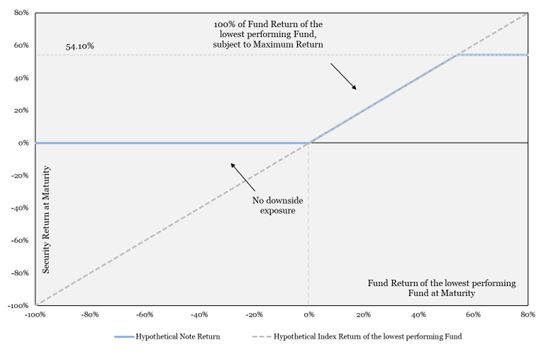 principal amount plus a positive return equal to 100% of the percentage increase in the price of the lowest performing Fund from its starting price, subject to a maximum return at maturity of