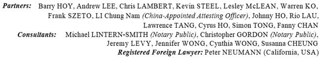 We are qualified lawyers of Hong Kong and as such are qualified to issue this opinion (the “Opinion”) on the laws and regulations of Hong Kong effective as of the date hereof. This Opinion is limited to matters of the laws of Hong Kong as in force and applied at the date of this Opinion. We have not investigated the laws of any jurisdiction other than Hong Kong and we express no opinion on the laws of any other jurisdiction.