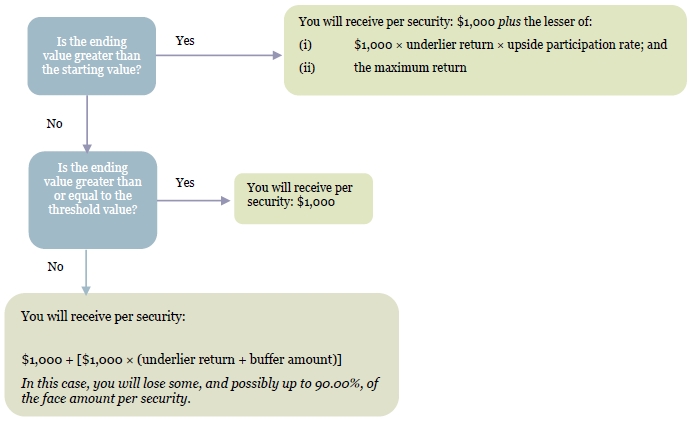 | If the ending value is less than the threshold value, you will have 1-to-1 downside exposure to the decrease in the value of the Underlier in excess of the buffer amount and will lose some, and possibly up to 90%, of the face amount of your securities at maturity. | ||