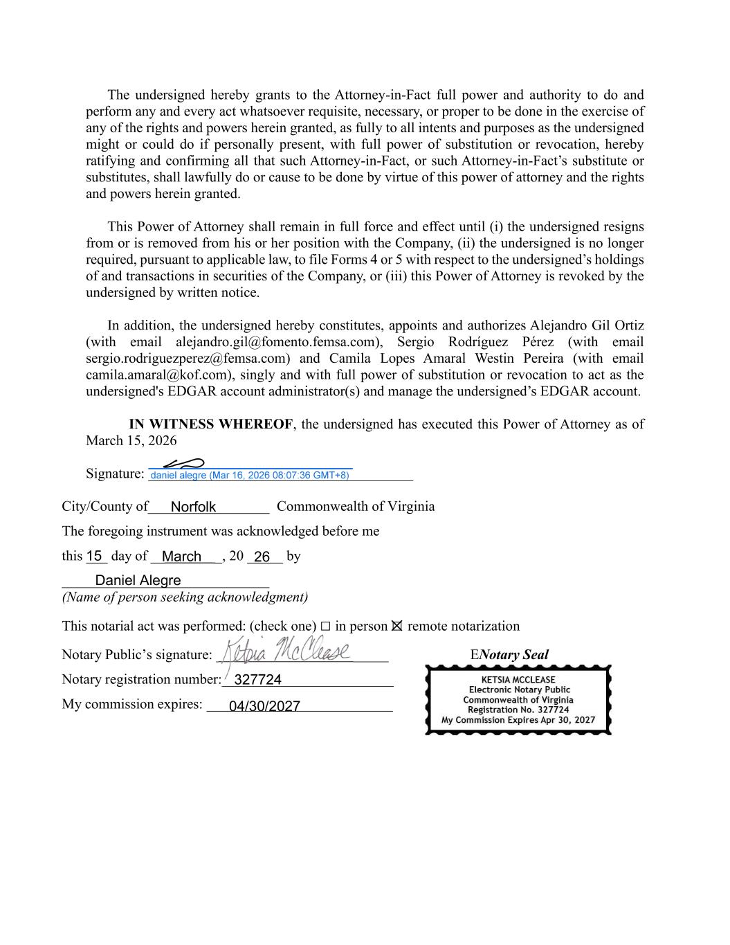 The undersigned hereby grants to the Attorney-in-Fact full power and authority to do and perform any and every act whatsoever requisite, necessary, or proper to be done in the exercise of any of the rights and powers herein granted, as fully to all intents and purposes as the undersigned might or could do if personally present, with full power of substitution or revocation, hereby ratifying and confirming all that such Attorney-in-Fact, or such Attorney-in-Fact’s substitute or substitutes, shall lawfully do or cause to be done by virtue of this power of attorney and the rights and powers herein granted. This Power of Attorney shall remain in full force and effect until (i) the undersigned resigns from or is removed from his or her position with the Company, (ii) the undersigned is no longer required, pursuant to applicable law, to file Forms 4 or 5 with respect to the undersigned’s holdings of and transactions in securities of the Company, or (iii) this Power of Attorney is revoked by the undersigned by written notice. In addition, the undersigned hereby constitutes, appoints and authorizes Alejandro Gil Ortiz (with email alejandro.gil@fomento.femsa.com), Sergio Rodríguez Pérez (with email sergio.rodriguezperez@femsa.com) and Camila Lopes Amaral Westin Pereira (with email camila.amaral@kof.com), singly and with full power of substitution or revocation to act as the undersigned's EDGAR account administrator(s) and manage the undersigned’s EDGAR account. IN WITNESS WHEREOF, the undersigned has executed this Power of Attorney as of , 2026 Signature: _____________________________________ City/County of_________________ Commonwealth of Virginia The foregoing instrument was acknowledged before me this ___ day of __ _, 20 _____ by _____________________________ (Name of person seeking acknowledgment) This notarial act was performed: (check one) in person remote notarization Notary Public’s signature: ________________________ ENotary Seal Notary registration number:________________________ My commission expires: __________________________ Norfolk Daniel Alegre 2615 March 327724 04/30/2027