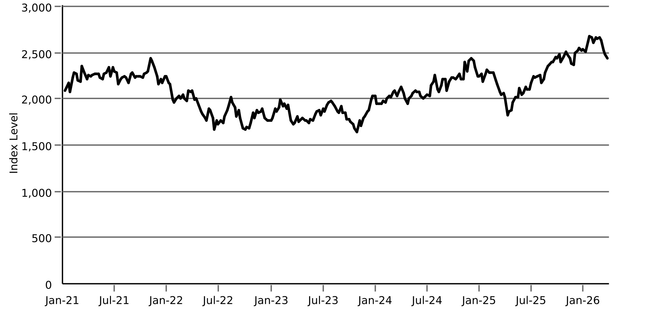 The following graphs set forth the historical performance of each Index based on the weekly historical closing levels from January 8, 2021 through March 20, 2026. The closing level of the Nasdaq-100 Index® on March 26, 2026 was 23,586.99. The closing level of the Russell 2000® Index on March 26, 2026 was 2,493.321. The closing level of the S&P 500® Index on March 26, 2026 was 6,477.16. We obtained the closing levels above and below from the Bloomberg Professional® service (“Bloomberg”), without independent verification.