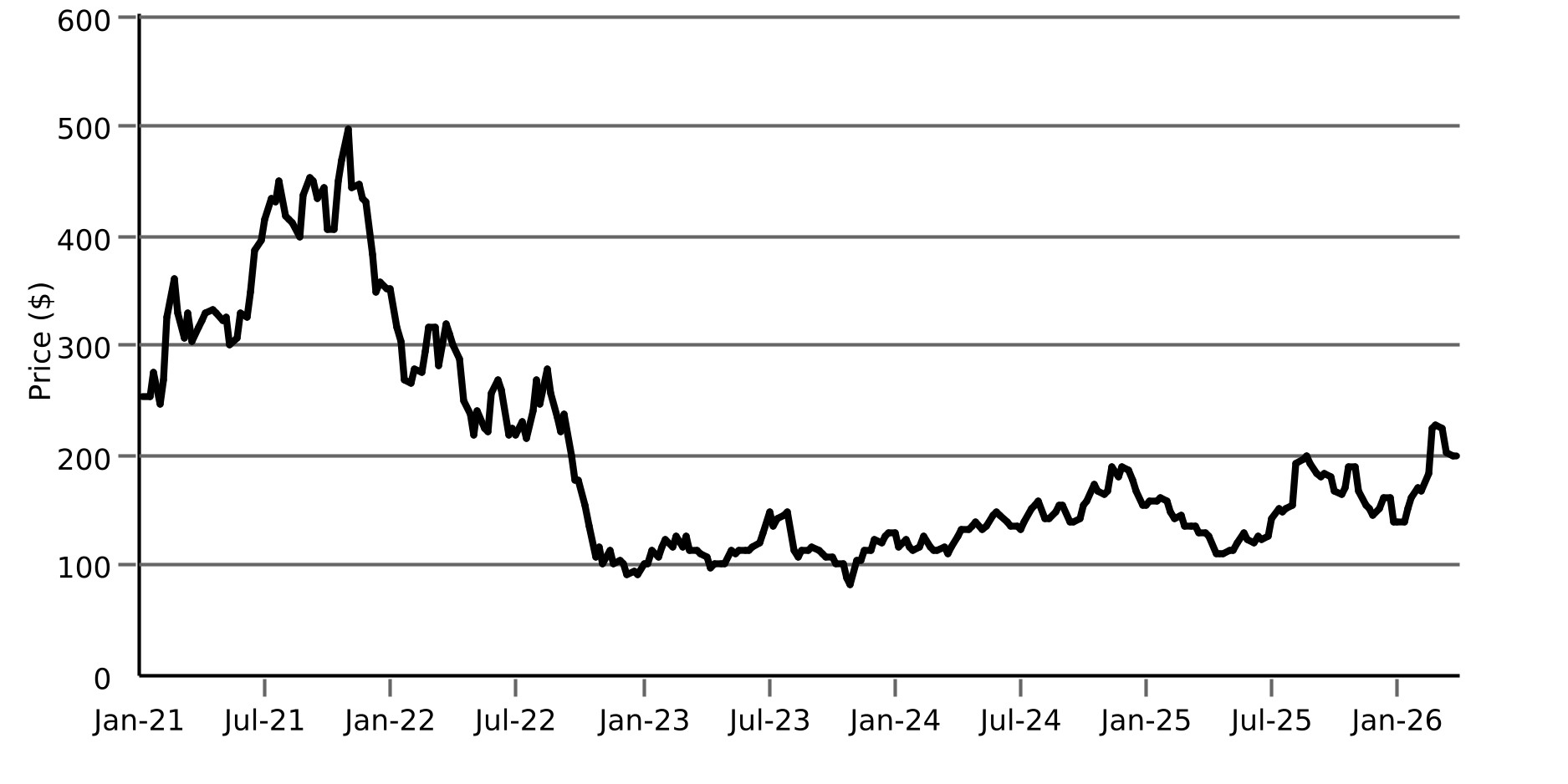 The following graph sets forth the historical performance of the Reference Stock based on the weekly historical closing prices of one share of the Reference Stock from January 8, 2021 through March 20, 2026. The closing price of one share of the Reference Stock on March 26, 2026 was $198.00. We obtained the closing prices of one share of the Reference Stock above and below from the Bloomberg Professional® service (“Bloomberg”), without independent verification. The closing prices above and below may have been adjusted by Bloomberg for corporate actions, such as stock splits, public offerings, mergers and acquisitions, spin-offs, delistings and bankruptcy.