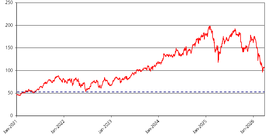 We obtained the information regarding the historical performance of the Reference Asset in the graph below from Bloomberg, without independent review or verification. The graph below illustrates the performance of the Reference Asset from January 1, 2021 through March 27, 2026. The dotted line represents the Contingent Coupon Barrier Value and Barrier Value of $53.14, which is equal to 50.00% of the Initial Value.