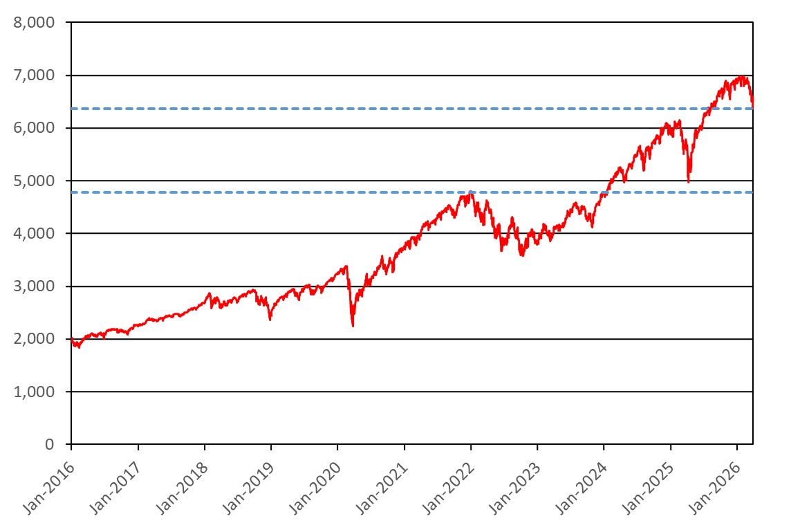 The graph below illustrates the performance of the underlying asset for the period from January 1, 2016 through March 27, 2026, based on the daily closing levels as reported by Bloomberg, without independent verification. The closing level of the underlying asset on March 27, 2026 was 6,368.85. The dotted lines represent the autocall barrier of 6,368.85 and the downside threshold of 4,776.64, which are equal to 100.00% and 75.00%, respectively, of the initial level. Past performance of the underlying asset is not indicative of the future performance of the underlying asset during the term of the Securities.