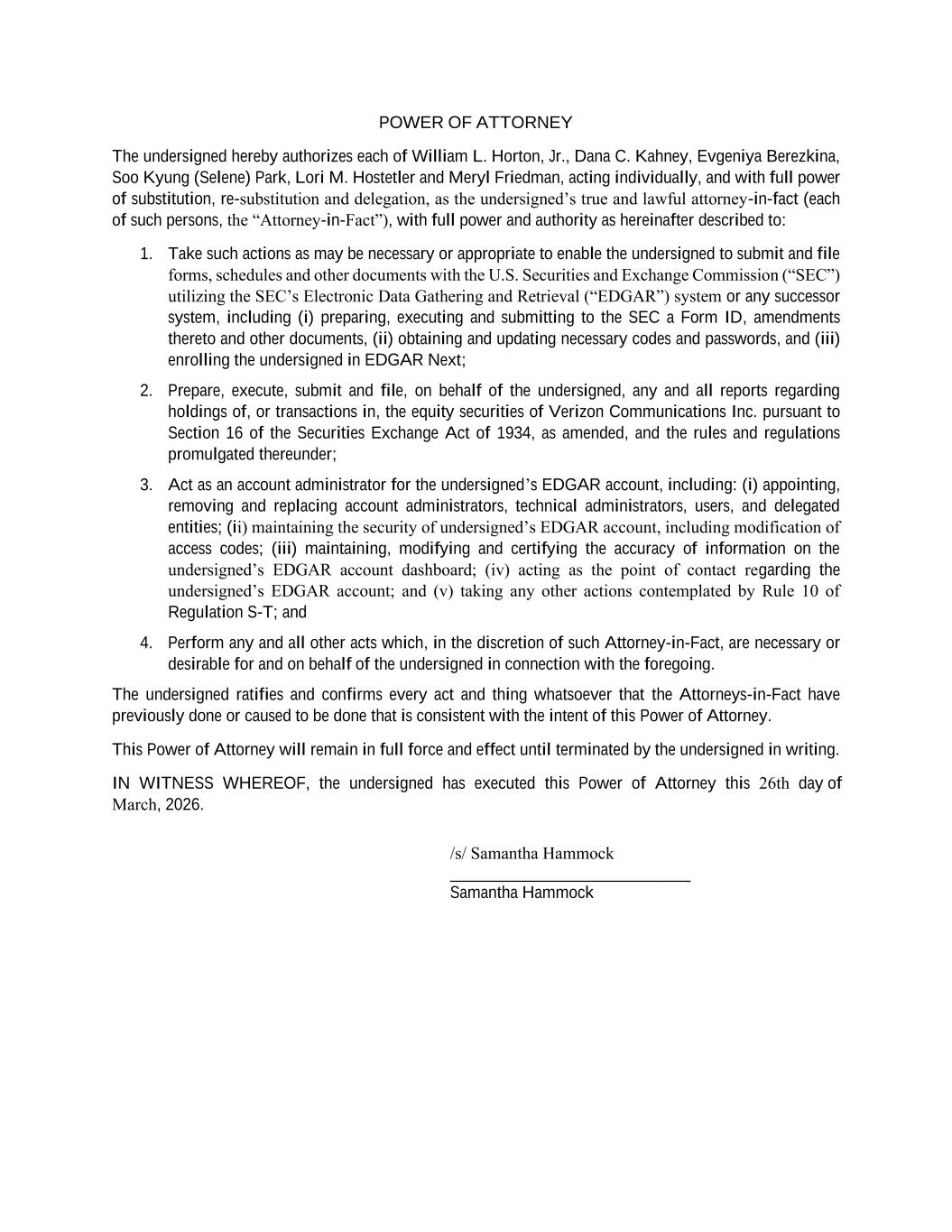 POWER OF ATTORNEY The undersigned hereby authorizes each of William L. Horton, Jr., Dana C. Kahney, Evgeniya Berezkina, Soo Kyung (Selene) Park, Lori M. Hostetler and Meryl Friedman, acting individually, and with full power of substitution, re-substitution and delegation, as the undersigned’s true and lawful attorney-in-fact (each of such persons, the “Attorney-in-Fact”), with full power and authority as hereinafter described to: 1. Take such actions as may be necessary or appropriate to enable the undersigned to submit and file forms, schedules and other documents with the U.S. Securities and Exchange Commission (“SEC”) utilizing the SEC’s Electronic Data Gathering and Retrieval (“EDGAR”) system or any successor system, including (i) preparing, executing and submitting to the SEC a Form ID, amendments thereto and other documents, (ii) obtaining and updating necessary codes and passwords, and (iii) enrolling the undersigned in EDGAR Next; 2. Prepare, execute, submit and file, on behalf of the undersigned, any and all reports regarding holdings of, or transactions in, the equity securities of Verizon Communications Inc. pursuant to Section 16 of the Securities Exchange Act of 1934, as amended, and the rules and regulations promulgated thereunder; 3. Act as an account administrator for the undersigned’s EDGAR account, including: (i) appointing, removing and replacing account administrators, technical administrators, users, and delegated entities; (ii) maintaining the security of undersigned’s EDGAR account, including modification of access codes; (iii) maintaining, modifying and certifying the accuracy of information on the undersigned’s EDGAR account dashboard; (iv) acting as the point of contact regarding the undersigned’s EDGAR account; and (v) taking any other actions contemplated by Rule 10 of Regulation S-T; and 4. Perform any and all other acts which, in the discretion of such Attorney-in-Fact, are necessary or desirable for and on behalf of the undersigned in connection with the foregoing. The undersigned ratifies and confirms every act and thing whatsoever that the Attorneys-in-Fact have previously done or caused to be done that is consistent with the intent of this Power of Attorney. This Power of Attorney will remain in full force and effect until terminated by the undersigned in writing. IN WITNESS WHEREOF, the undersigned has executed this Power of Attorney this 26th day of March, 2026. /s/ Samantha Hammock ____________________________ Samantha Hammock