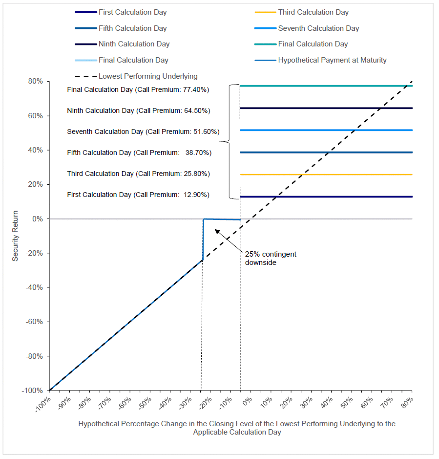 The call payment will be an amount in cash per face amount corresponding to a return at a per-annum rate that will be set on the pricing date, as follows: ●1st calculation day: at least $1,129.00, which corresponds to a call premium of at least 12.90% ●2nd calculation day: at least $1,193.50, which corresponds to a call premium of at least 19.35% ●3rd calculation day: at least $1,258.00, which corresponds to a call premium of at least 25.80% ●4th calculation day: at least $1,322.50, which corresponds to a call premium of at least 32.25% ●5th calculation day: at least $1,387.00, which corresponds to a call premium of at least 38.70% ●6th calculation day: at least $1,451.50, which corresponds to a call premium of at least 45.15% ●7th calculation day: at least $1,516.00, which corresponds to a call premium of at least 51.60% ●8th calculation day: at least $1,580.50, which corresponds to a call premium of at least 58.05% ●9th calculation day: at least $1,645.00, which corresponds to a call premium of at least 64.50% ●10th calculation day: at least $1,709.50, which corresponds to a call premium of at least 70.95% ●Final calculation day: at least $1,774.00, which corresponds to a call premium of at least 77.40% The actual call payment and call premium applicable to each calculation day will be determined on the pricing date. No further payments will be made on the securities once they have been called. |