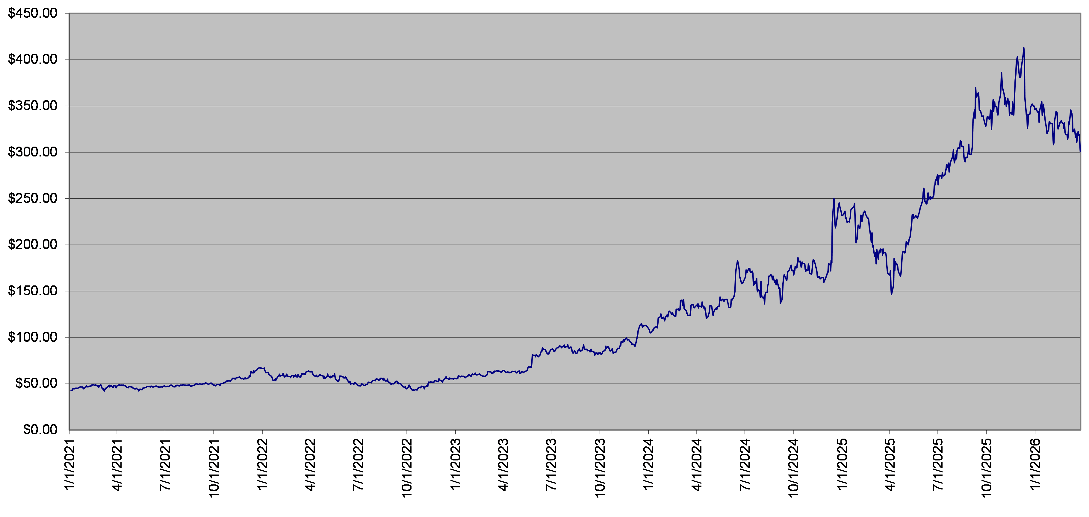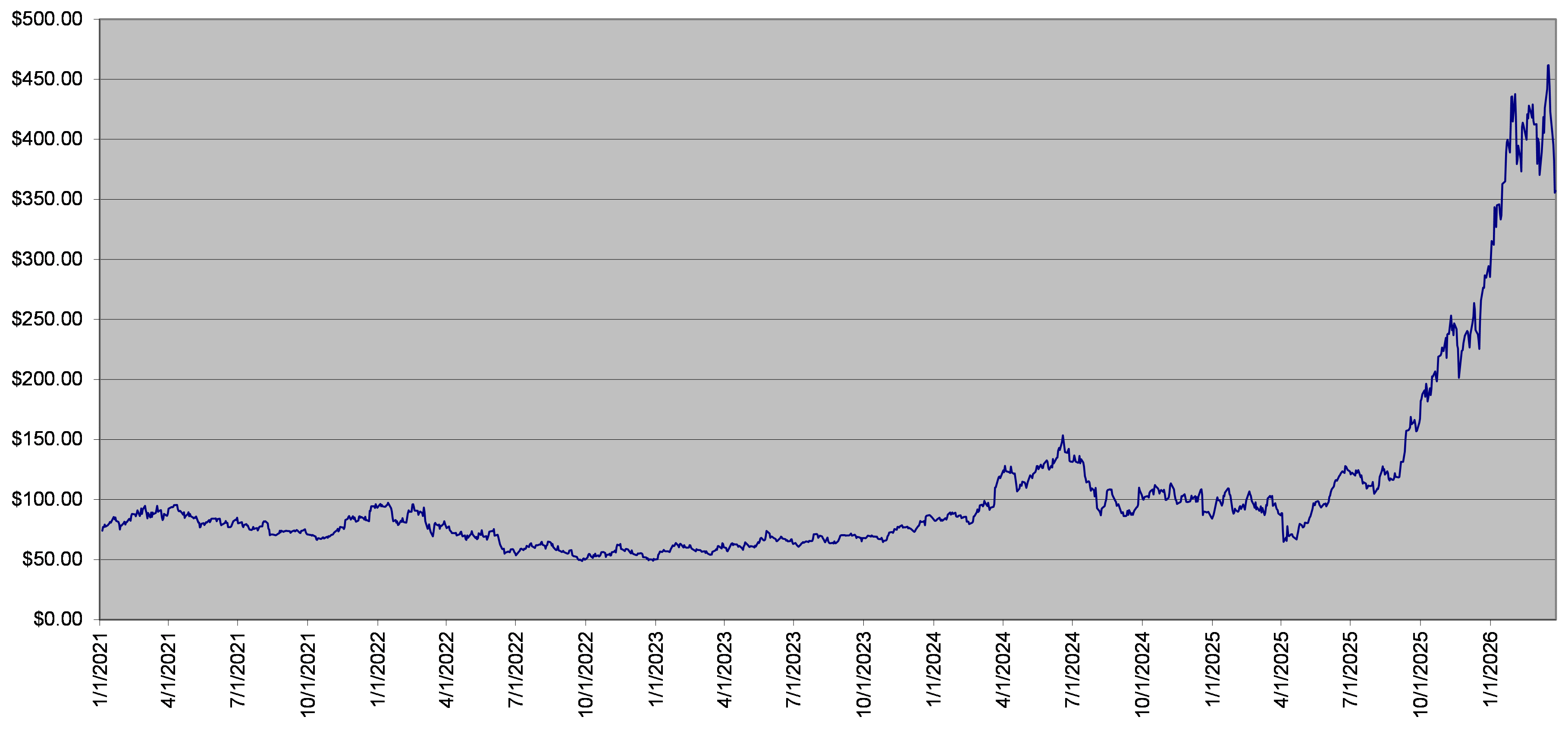 MU Stock Daily Closing Levels January 1, 2021 to March 27, 2026 |