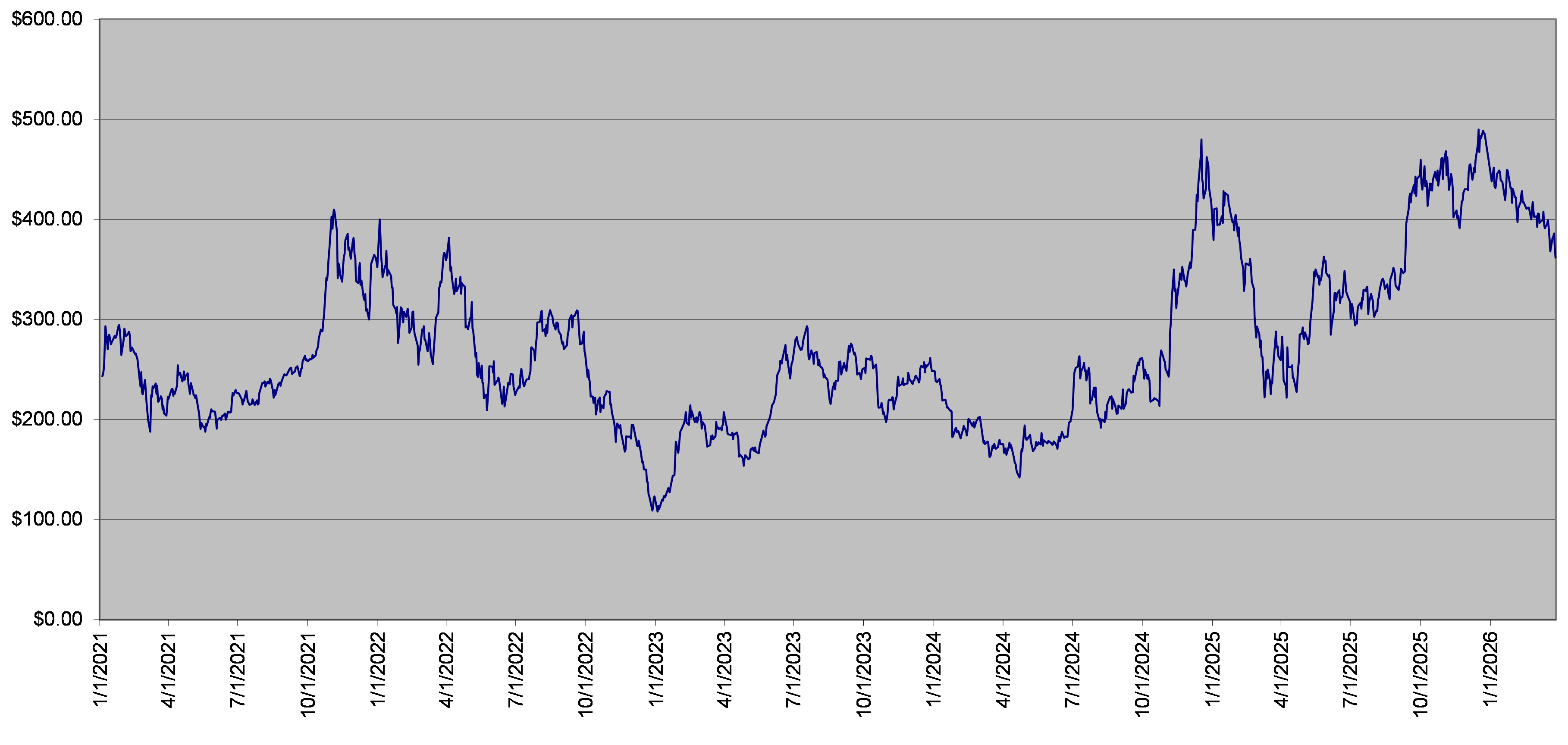 The closing level of the TSLA Stock on March 27, 2026 was $361.83. The following graph sets forth the daily closing levels of the underlier for the period noted below. We obtained the historical information presented in this document from Bloomberg Financial Markets, without independent verification. The underlier has at times experienced periods of high volatility. You should not take the historical closing levels of the underlier as an indication of its future performance, and no assurance can be given as to the closing level of the underlier at any time.