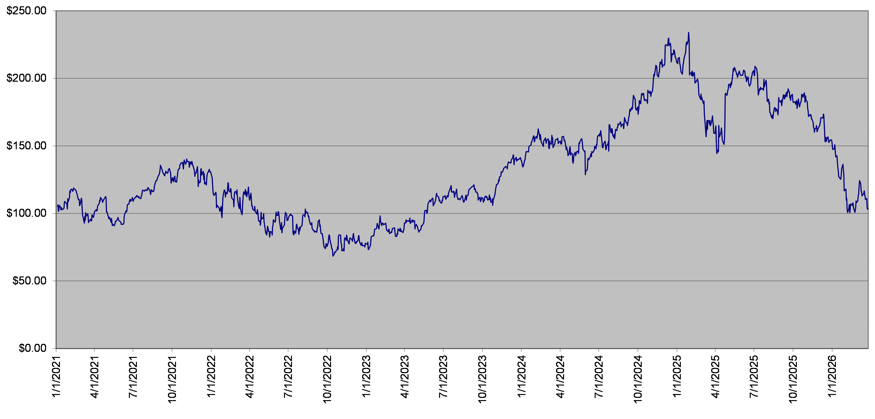 The closing level of the underlier on March 26, 2026 was $103.64. The following graph sets forth the daily closing levels of the underlier for the period noted below. We obtained the historical information presented in this document from Bloomberg Financial Markets, without independent verification. The underlier has at times experienced periods of high volatility. You should not take the historical closing levels of the underlier as an indication of its future performance, and no assurance can be given as to the closing level of the underlier at any time.