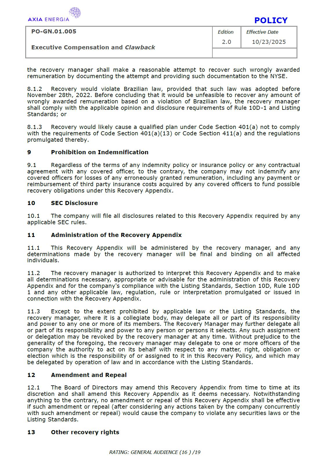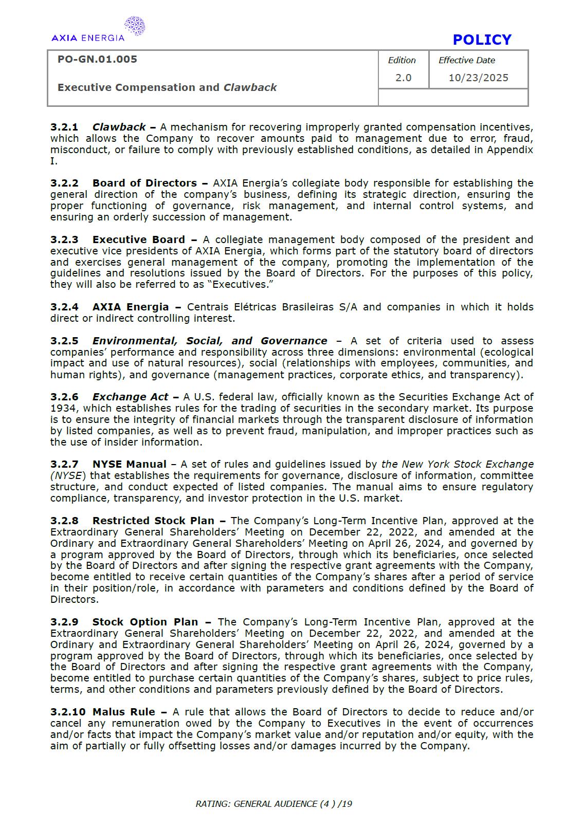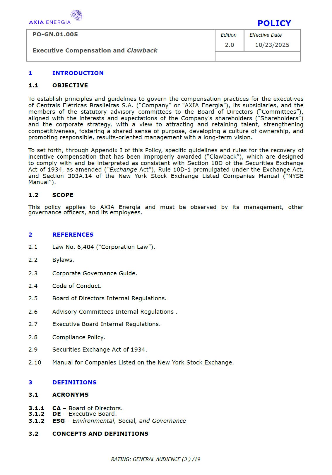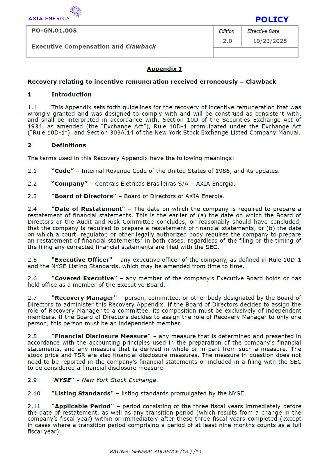 POLICY PO-GN.01.005 Edition Effective Date Executive Compensation and Clawback 2.0 10/23/2025 RATING: GENERAL AUDIENCE (1 ) /19 PREPARED BY: Vice Presidency of Governance and Sustainability Corporate Governance Department REVIEW/SUPPORT: Processes and Regulations Management Certifications Management Compliance Department Corporate Governance Division General Legal Department APPROVAL: Executive Board (DE) – RES-390/2025, dated October 13, 2025 Board of Directors (BD) – DEL-177/2025, dated October 23, 2025 TERM: 5 years The content of this document may not be reproduced without proper authorization. All rights belong to AXIA Energia. POLICY PO-GN.01.005 Edition Effective Date Executive Compensation and Clawback 2.0 10/23/2025 RATING: GENERAL AUDIENCE (2 ) /19 TABLE OF CONTENTS 1 Introduction .................................................................................................................................................. 3 2 References .................................................................................................................................................... 3 3 Conceptualization ....................................................................................................................................... 3 4 Principles ....................................................................................................................................................... 5 5 Guidelines ..................................................................................................................................................... 6 6 Responsibilities ............................................................................................................................................ 10 7 General Provisions ..................................................................................................................................... 11 8 Revision History .......................................................................................................................................... 12 9 Appendices.................................................................................................................................................... 13 POLICY PO-GN.01.005 Edition Effective Date Executive Compensation and Clawback 2.0 10/23/2025 RATING: GENERAL AUDIENCE (3 ) /19 1 INTRODUCTION 1.1 OBJECTIVE To establish principles and guidelines to govern the compensation practices for the executives of Centrais Elétricas Brasileiras S.A. (“Company” or “AXIA Energia”), its subsidiaries, and the members of the statutory advisory committees to the Board of Directors (“Committees”), aligned with the interests and expectations of the Company’s shareholders (“Shareholders”) and the corporate strategy, with a view to attracting and retaining talent, strengthening competitiveness, fostering a shared sense of purpose, developing a culture of ownership, and promoting responsible, results-oriented management with a long-term vision. To set forth, through Appendix I of this Policy, specific guidelines and rules for the recovery of incentive compensation that has been improperly awarded (“Clawback”), which are designed to comply with and be interpreted as consistent with Section 10D of the Securities Exchange Act of 1934, as amended (“Exchange Act”), Rule 10D-1 promulgated under the Exchange Act, and Section 303A.14 of the New York Stock Exchange Listed Companies Manual (“NYSE Manual”). 1.2 SCOPE This policy applies to AXIA Energia and must be observed by its management, other governance officers, and its employees. 2 REFERENCES 2.1 Law No. 6,404 (“Corporation Law”). 2.2 Bylaws. 2.3 Corporate Governance Guide. 2.4 Code of Conduct. 2.5 Board of Directors Internal Regulations. 2.6 Advisory Committees Internal Regulations . 2.7 Executive Board Internal Regulations. 2.8 Compliance Policy. 2.9 Securities Exchange Act of 1934. 2.10 Manual for Companies Listed on the New York Stock Exchange. 3 DEFINITIONS 3.1 ACRONYMS 3.1.1 CA – Board of Directors. 3.1.2 DE – Executive Board. 3.1.2 ESG – Environmental, Social, and Governance 3.2 CONCEPTS AND DEFINITIONS POLICY PO-GN.01.005 Edition Effective Date Executive Compensation and Clawback 2.0 10/23/2025 RATING: GENERAL AUDIENCE (4 ) /19 3.2.1 Clawback – A mechanism for recovering improperly granted compensation incentives, which allows the Company to recover amounts paid to management due to error, fraud, misconduct, or failure to comply with previously established conditions, as detailed in Appendix I. 3.2.2 Board of Directors – AXIA Energia’s collegiate body responsible for establishing the general direction of the company’s business, defining its strategic direction, ensuring the proper functioning of governance, risk management, and internal control systems, and ensuring an orderly succession of management. 3.2.3 Executive Board – A collegiate management body composed of the president and executive vice presidents of AXIA Energia, which forms part of the statutory board of directors and exercises general management of the company, promoting the implementation of the guidelines and resolutions issued by the Board of Directors. For the purposes of this policy, they will also be referred to as “Executives.” 3.2.4 AXIA Energia – Centrais Elétricas Brasileiras S/A and companies in which it holds direct or indirect controlling interest. 3.2.5 Environmental, Social, and Governance – A set of criteria used to assess companies’ performance and responsibility across three dimensions: environmental (ecological impact and use of natural resources), social (relationships with employees, communities, and human rights), and governance (management practices, corporate ethics, and transparency). 3.2.6 Exchange Act – A U.S. federal law, officially known as the Securities Exchange Act of 1934, which establishes rules for the trading of securities in the 