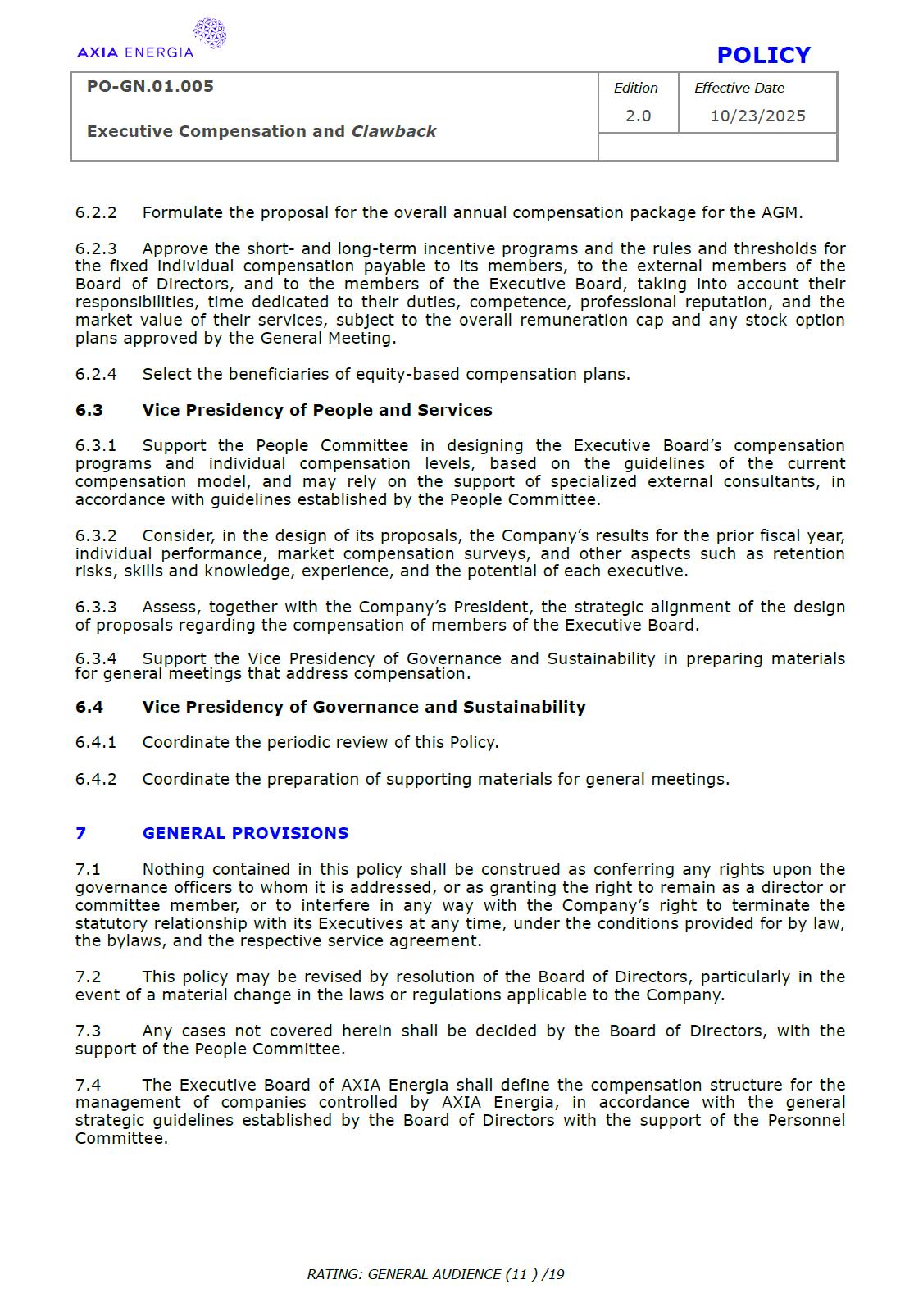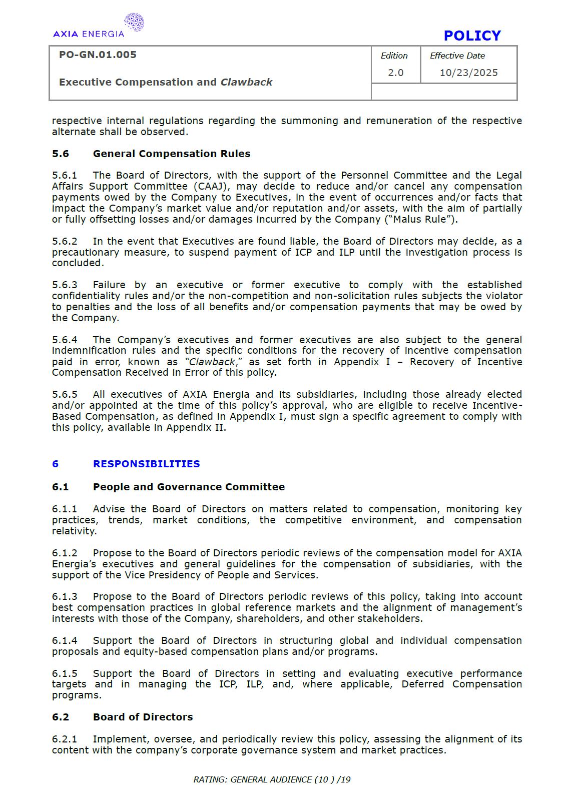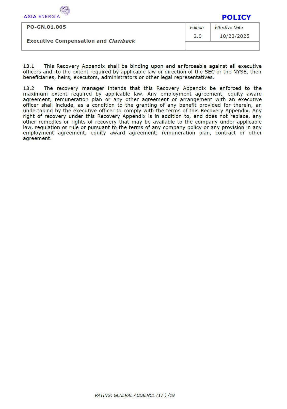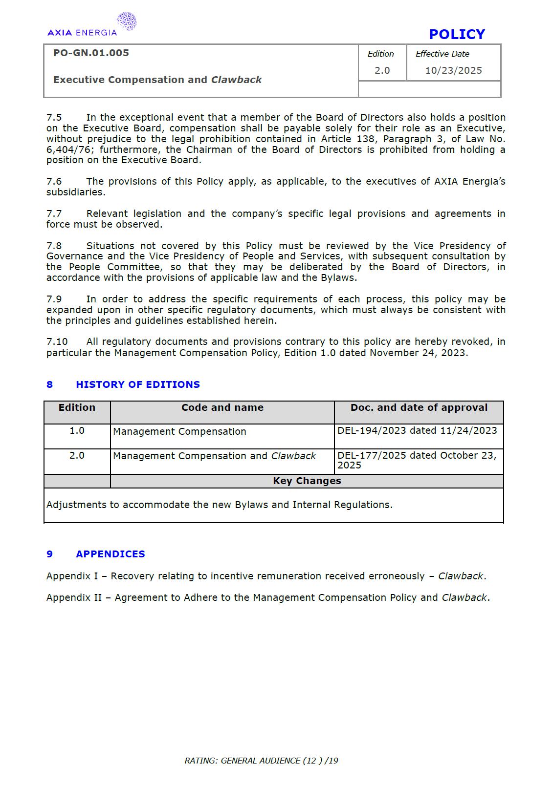 POLICY PO-GN.01.005 Edition Effective Date Executive Compensation and Clawback 2.0 10/23/2025 RATING: GENERAL AUDIENCE (1 ) /19 PREPARED BY: Vice Presidency of Governance and Sustainability Corporate Governance Department REVIEW/SUPPORT: Processes and Regulations Management Certifications Management Compliance Department Corporate Governance Division General Legal Department APPROVAL: Executive Board (DE) – RES-390/2025, dated October 13, 2025 Board of Directors (BD) – DEL-177/2025, dated October 23, 2025 TERM: 5 years The content of this document may not be reproduced without proper authorization. All rights belong to AXIA Energia. POLICY PO-GN.01.005 Edition Effective Date Executive Compensation and Clawback 2.0 10/23/2025 RATING: GENERAL AUDIENCE (2 ) /19 TABLE OF CONTENTS 1 Introduction .................................................................................................................................................. 3 2 References .................................................................................................................................................... 3 3 Conceptualization ....................................................................................................................................... 3 4 Principles ....................................................................................................................................................... 5 5 Guidelines ..................................................................................................................................................... 6 6 Responsibilities ............................................................................................................................................ 10 7 General Provisions ..................................................................................................................................... 11 8 Revision History .......................................................................................................................................... 12 9 Appendices.................................................................................................................................................... 13 POLICY PO-GN.01.005 Edition Effective Date Executive Compensation and Clawback 2.0 10/23/2025 RATING: GENERAL AUDIENCE (3 ) /19 1 INTRODUCTION 1.1 OBJECTIVE To establish principles and guidelines to govern the compensation practices for the executives of Centrais Elétricas Brasileiras S.A. (“Company” or “AXIA Energia”), its subsidiaries, and the members of the statutory advisory committees to the Board of Directors (“Committees”), aligned with the interests and expectations of the Company’s shareholders (“Shareholders”) and the corporate strategy, with a view to attracting and retaining talent, strengthening competitiveness, fostering a shared sense of purpose, developing a culture of ownership, and promoting responsible, results-oriented management with a long-term vision. To set forth, through Appendix I of this Policy, specific guidelines and rules for the recovery of incentive compensation that has been improperly awarded (“Clawback”), which are designed to comply with and be interpreted as consistent with Section 10D of the Securities Exchange Act of 1934, as amended (“Exchange Act”), Rule 10D-1 promulgated under the Exchange Act, and Section 303A.14 of the New York Stock Exchange Listed Companies Manual (“NYSE Manual”). 1.2 SCOPE This policy applies to AXIA Energia and must be observed by its management, other governance officers, and its employees. 2 REFERENCES 2.1 Law No. 6,404 (“Corporation Law”). 2.2 Bylaws. 2.3 Corporate Governance Guide. 2.4 Code of Conduct. 2.5 Board of Directors Internal Regulations. 2.6 Advisory Committees Internal Regulations . 2.7 Executive Board Internal Regulations. 2.8 Compliance Policy. 2.9 Securities Exchange Act of 1934. 2.10 Manual for Companies Listed on the New York Stock Exchange. 3 DEFINITIONS 3.1 ACRONYMS 3.1.1 CA – Board of Directors. 3.1.2 DE – Executive Board. 3.1.2 ESG – Environmental, Social, and Governance 3.2 CONCEPTS AND DEFINITIONS POLICY PO-GN.01.005 Edition Effective Date Executive Compensation and Clawback 2.0 10/23/2025 RATING: GENERAL AUDIENCE (4 ) /19 3.2.1 Clawback – A mechanism for recovering improperly granted compensation incentives, which allows the Company to recover amounts paid to management due to error, fraud, misconduct, or failure to comply with previously established conditions, as detailed in Appendix I. 3.2.2 Board of Directors – AXIA Energia’s collegiate body responsible for establishing the general direction of the company’s business, defining its strategic direction, ensuring the proper functioning of governance, risk management, and internal control systems, and ensuring an orderly succession of management. 3.2.3 Executive Board – A collegiate management body composed of the president and executive vice presidents of AXIA Energia, which forms part of the statutory board of directors and exercises general management of the company, promoting the implementation of the guidelines and resolutions issued by the Board of Directors. For the purposes of this policy, they will also be referred to as “Executives.” 3.2.4 AXIA Energia – Centrais Elétricas Brasileiras S/A and companies in which it holds direct or indirect controlling interest. 3.2.5 Environmental, Social, and Governance – A set of criteria used to assess companies’ performance and responsibility across three dimensions: environmental (ecological impact and use of natural resources), social (relationships with employees, communities, and human rights), and governance (management practices, corporate ethics, and transparency). 3.2.6 Exchange Act – A U.S. federal law, officially known as the Securities Exchange Act of 1934, which establishes rules for the trading of securities in the 