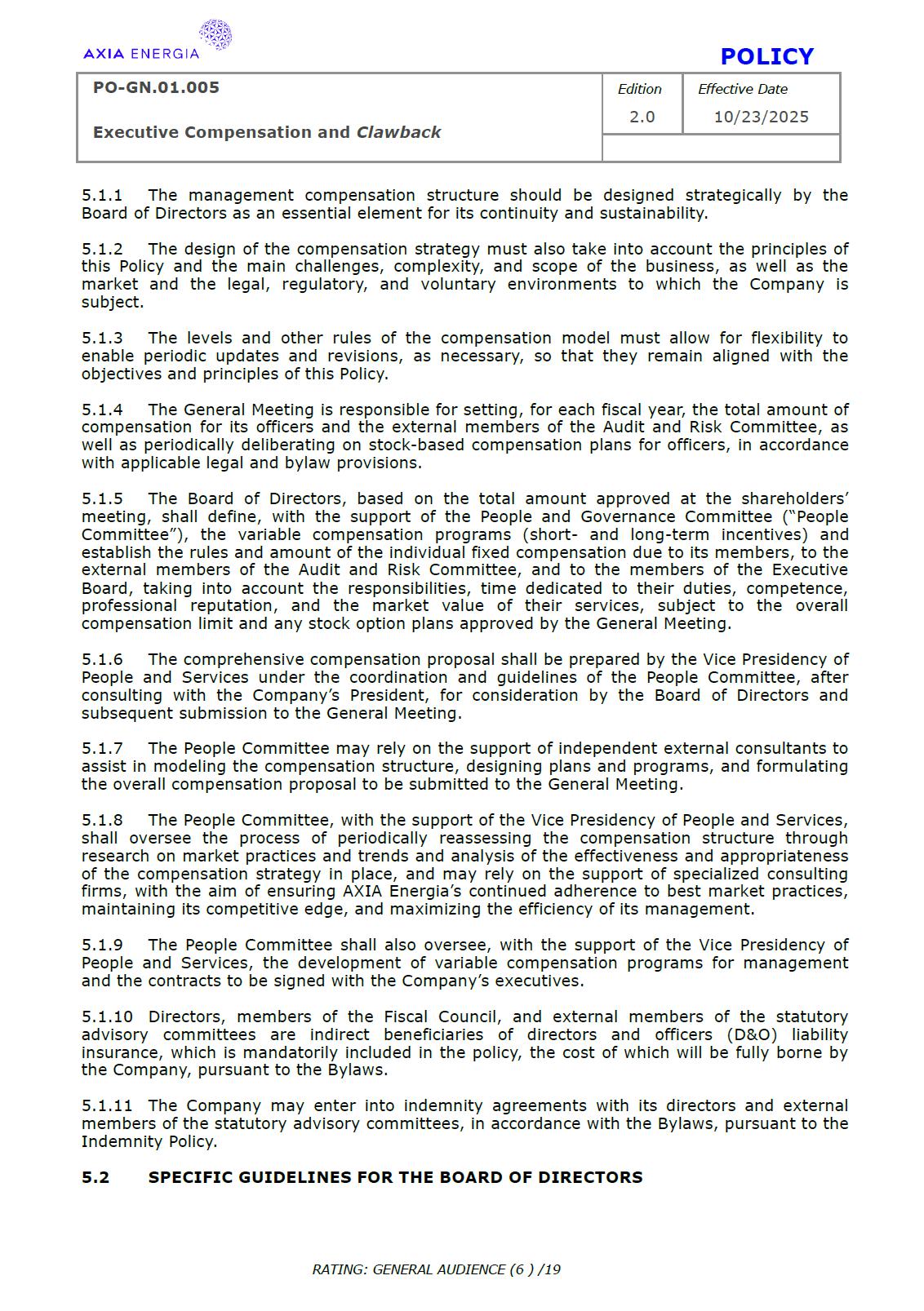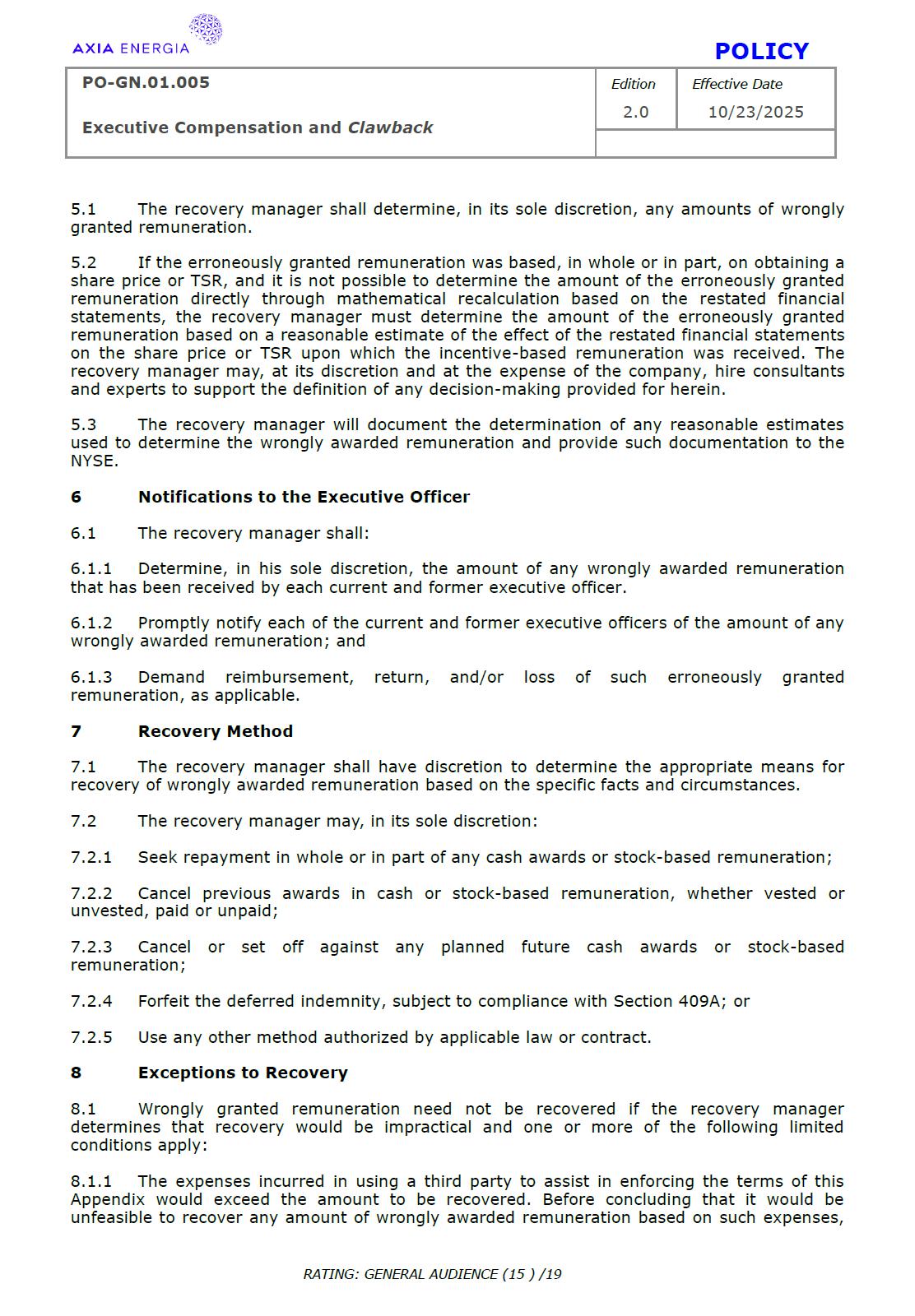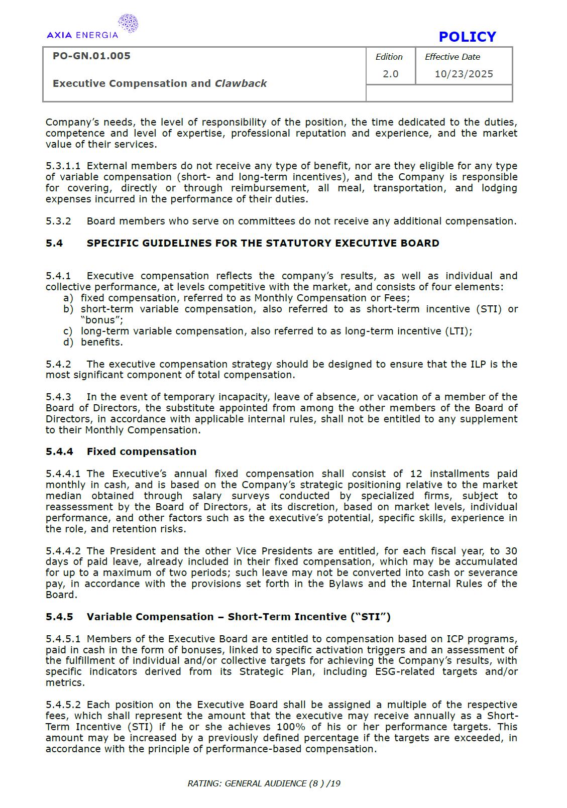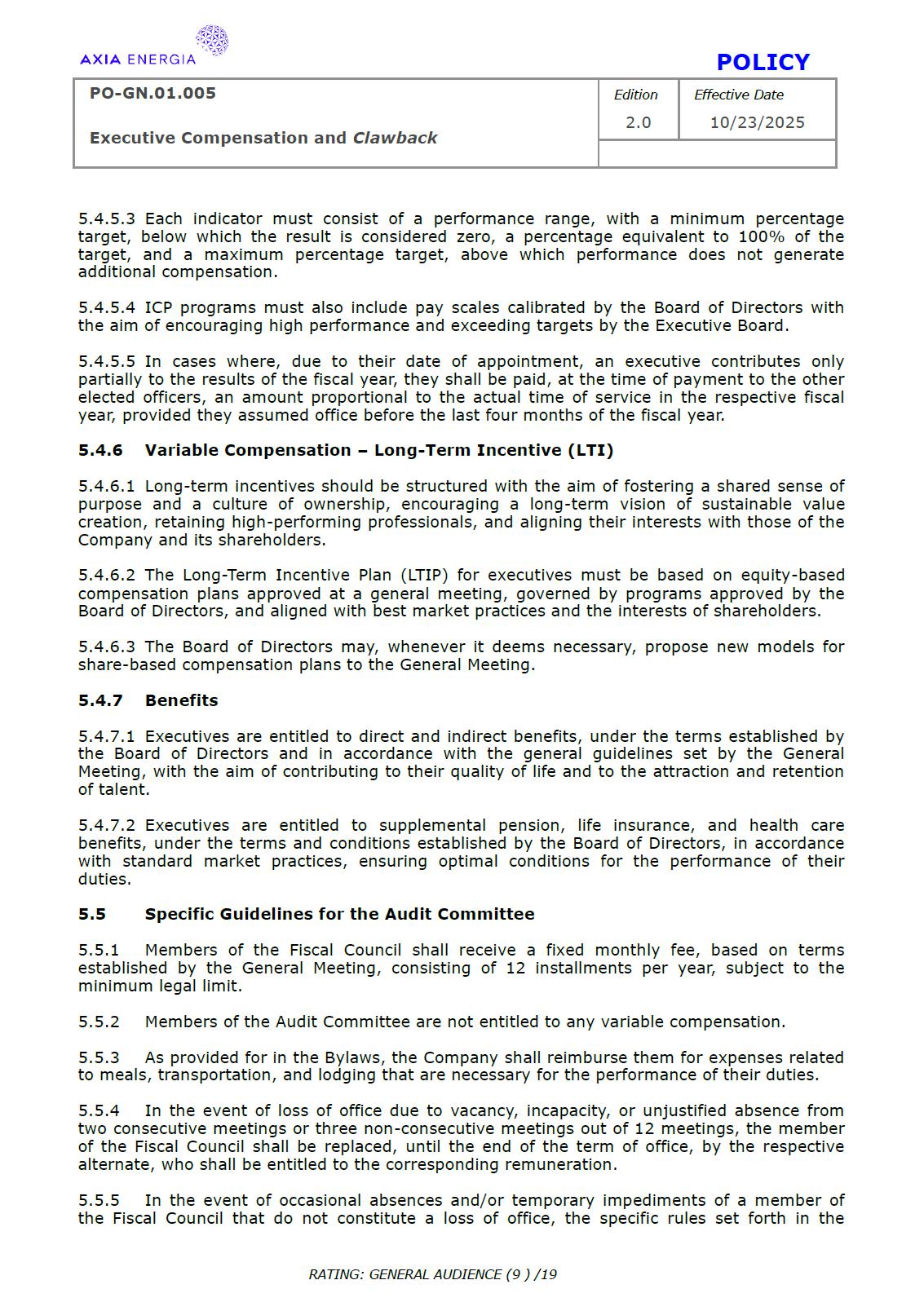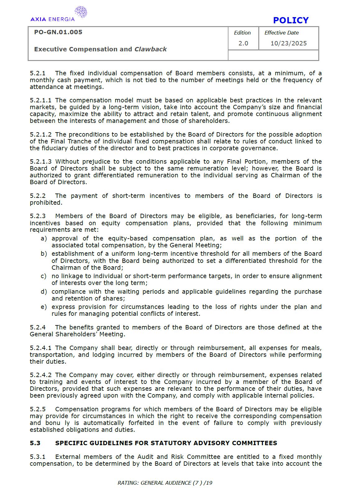 POLICY PO-GN.01.005 Edition Effective Date Executive Compensation and Clawback 2.0 10/23/2025 RATING: GENERAL AUDIENCE (1 ) /19 PREPARED BY: Vice Presidency of Governance and Sustainability Corporate Governance Department REVIEW/SUPPORT: Processes and Regulations Management Certifications Management Compliance Department Corporate Governance Division General Legal Department APPROVAL: Executive Board (DE) – RES-390/2025, dated October 13, 2025 Board of Directors (BD) – DEL-177/2025, dated October 23, 2025 TERM: 5 years The content of this document may not be reproduced without proper authorization. All rights belong to AXIA Energia. POLICY PO-GN.01.005 Edition Effective Date Executive Compensation and Clawback 2.0 10/23/2025 RATING: GENERAL AUDIENCE (2 ) /19 TABLE OF CONTENTS 1 Introduction .................................................................................................................................................. 3 2 References .................................................................................................................................................... 3 3 Conceptualization ....................................................................................................................................... 3 4 Principles ....................................................................................................................................................... 5 5 Guidelines ..................................................................................................................................................... 6 6 Responsibilities ............................................................................................................................................ 10 7 General Provisions ..................................................................................................................................... 11 8 Revision History .......................................................................................................................................... 12 9 Appendices.................................................................................................................................................... 13 POLICY PO-GN.01.005 Edition Effective Date Executive Compensation and Clawback 2.0 10/23/2025 RATING: GENERAL AUDIENCE (3 ) /19 1 INTRODUCTION 1.1 OBJECTIVE To establish principles and guidelines to govern the compensation practices for the executives of Centrais Elétricas Brasileiras S.A. (“Company” or “AXIA Energia”), its subsidiaries, and the members of the statutory advisory committees to the Board of Directors (“Committees”), aligned with the interests and expectations of the Company’s shareholders (“Shareholders”) and the corporate strategy, with a view to attracting and retaining talent, strengthening competitiveness, fostering a shared sense of purpose, developing a culture of ownership, and promoting responsible, results-oriented management with a long-term vision. To set forth, through Appendix I of this Policy, specific guidelines and rules for the recovery of incentive compensation that has been improperly awarded (“Clawback”), which are designed to comply with and be interpreted as consistent with Section 10D of the Securities Exchange Act of 1934, as amended (“Exchange Act”), Rule 10D-1 promulgated under the Exchange Act, and Section 303A.14 of the New York Stock Exchange Listed Companies Manual (“NYSE Manual”). 1.2 SCOPE This policy applies to AXIA Energia and must be observed by its management, other governance officers, and its employees. 2 REFERENCES 2.1 Law No. 6,404 (“Corporation Law”). 2.2 Bylaws. 2.3 Corporate Governance Guide. 2.4 Code of Conduct. 2.5 Board of Directors Internal Regulations. 2.6 Advisory Committees Internal Regulations . 2.7 Executive Board Internal Regulations. 2.8 Compliance Policy. 2.9 Securities Exchange Act of 1934. 2.10 Manual for Companies Listed on the New York Stock Exchange. 3 DEFINITIONS 3.1 ACRONYMS 3.1.1 CA – Board of Directors. 3.1.2 DE – Executive Board. 3.1.2 ESG – Environmental, Social, and Governance 3.2 CONCEPTS AND DEFINITIONS POLICY PO-GN.01.005 Edition Effective Date Executive Compensation and Clawback 2.0 10/23/2025 RATING: GENERAL AUDIENCE (4 ) /19 3.2.1 Clawback – A mechanism for recovering improperly granted compensation incentives, which allows the Company to recover amounts paid to management due to error, fraud, misconduct, or failure to comply with previously established conditions, as detailed in Appendix I. 3.2.2 Board of Directors – AXIA Energia’s collegiate body responsible for establishing the general direction of the company’s business, defining its strategic direction, ensuring the proper functioning of governance, risk management, and internal control systems, and ensuring an orderly succession of management. 3.2.3 Executive Board – A collegiate management body composed of the president and executive vice presidents of AXIA Energia, which forms part of the statutory board of directors and exercises general management of the company, promoting the implementation of the guidelines and resolutions issued by the Board of Directors. For the purposes of this policy, they will also be referred to as “Executives.” 3.2.4 AXIA Energia – Centrais Elétricas Brasileiras S/A and companies in which it holds direct or indirect controlling interest. 3.2.5 Environmental, Social, and Governance – A set of criteria used to assess companies’ performance and responsibility across three dimensions: environmental (ecological impact and use of natural resources), social (relationships with employees, communities, and human rights), and governance (management practices, corporate ethics, and transparency). 3.2.6 Exchange Act – A U.S. federal law, officially known as the Securities Exchange Act of 1934, which establishes rules for the trading of securities in the 