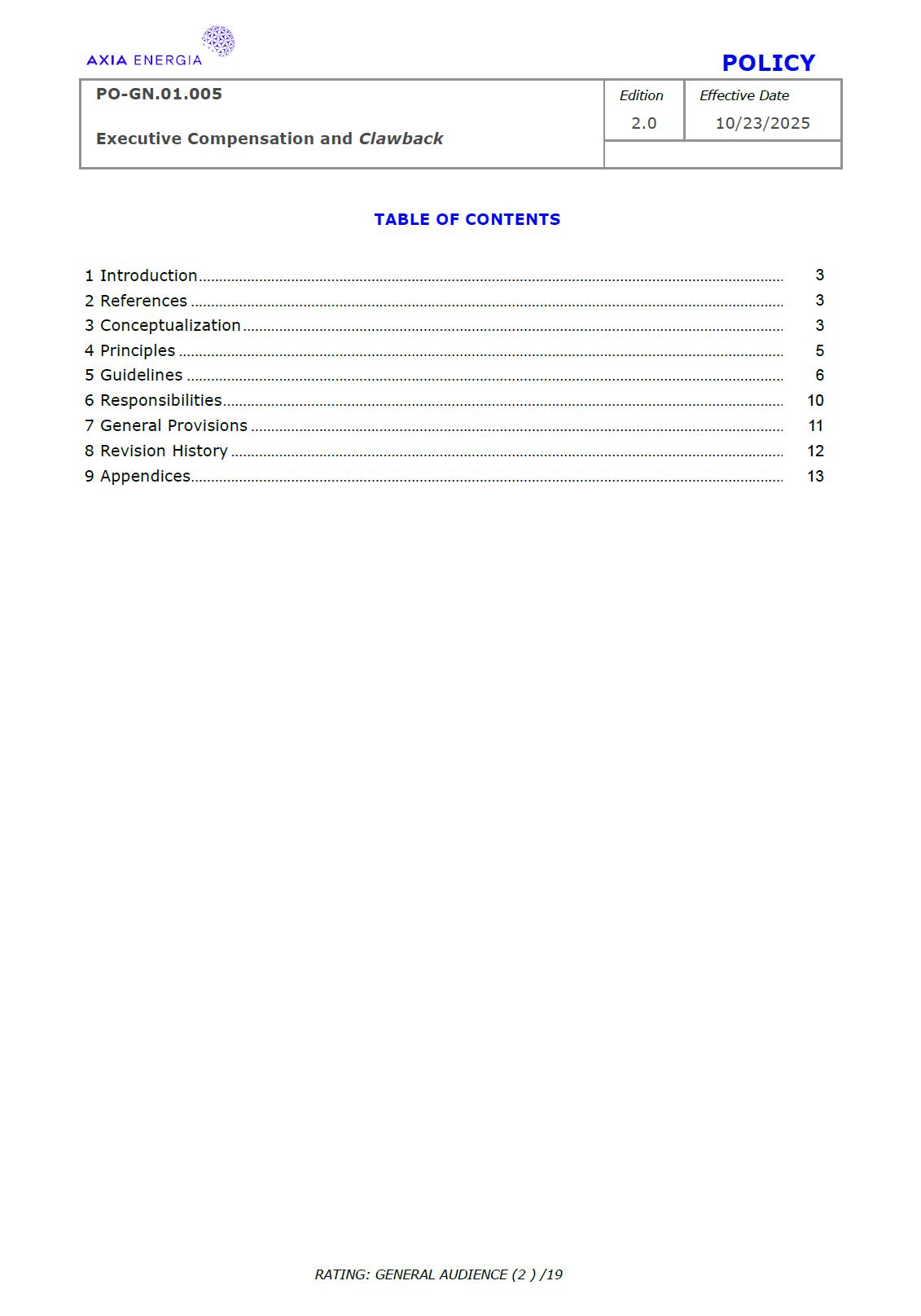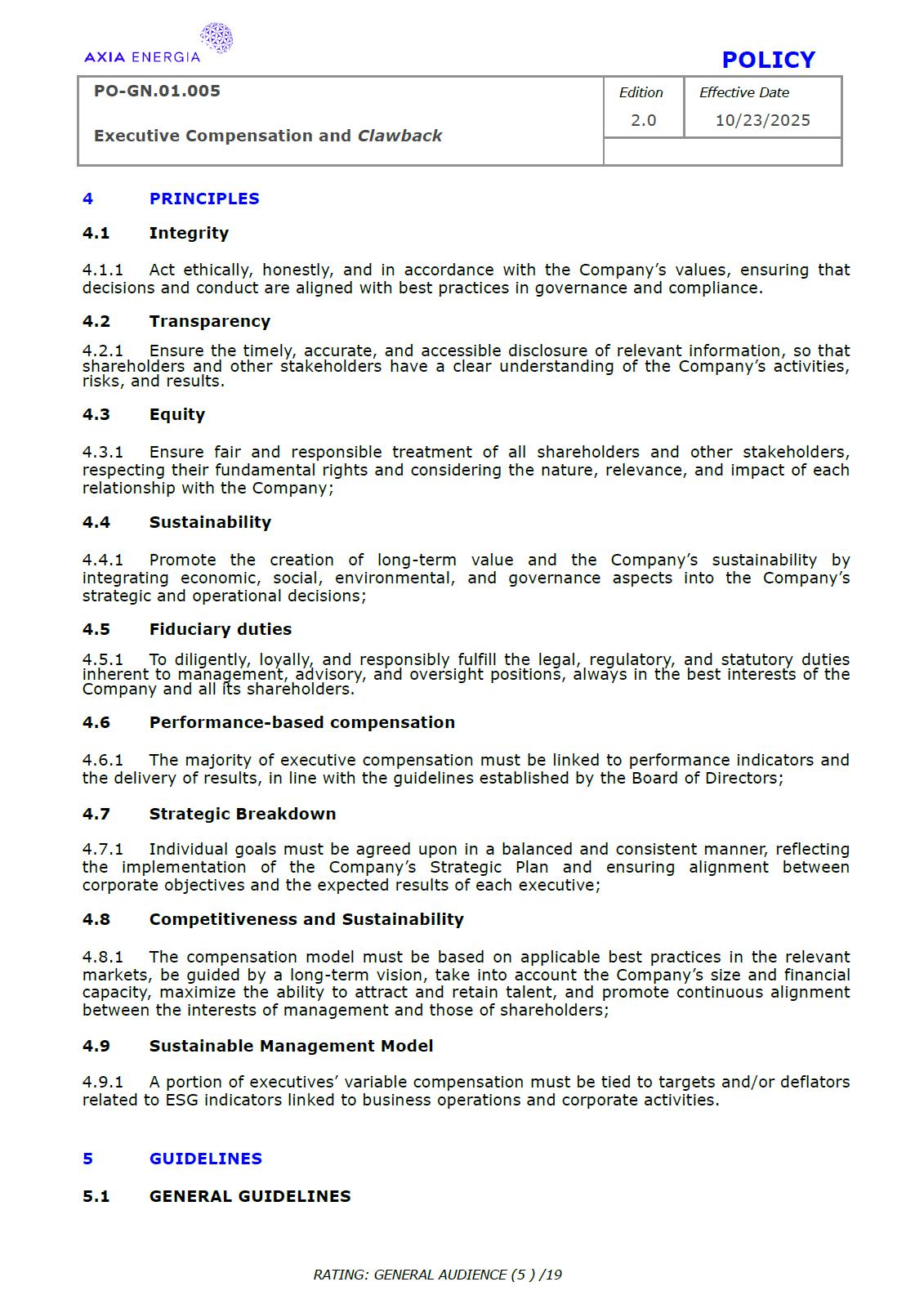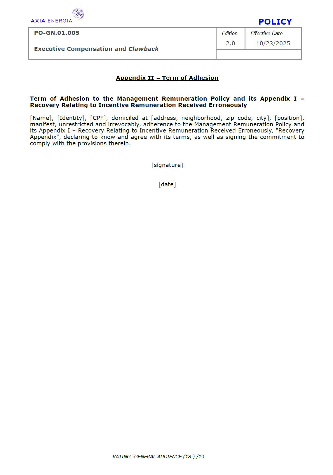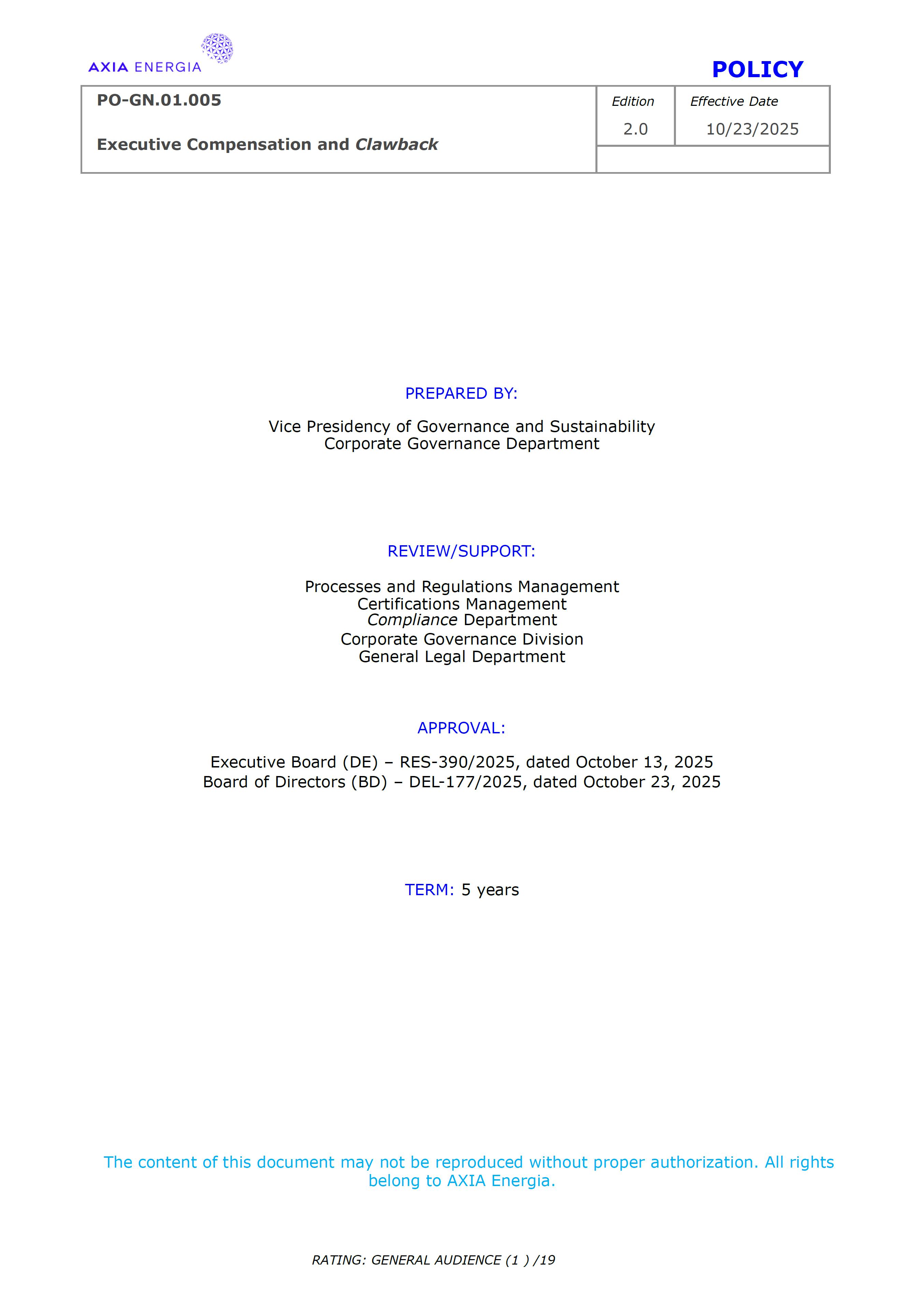POLICY PO-GN.01.005 Edition Effective Date Executive Compensation and Clawback 2.0 10/23/2025 RATING: GENERAL AUDIENCE (1 ) /19 PREPARED BY: Vice Presidency of Governance and Sustainability Corporate Governance Department REVIEW/SUPPORT: Processes and Regulations Management Certifications Management Compliance Department Corporate Governance Division General Legal Department APPROVAL: Executive Board (DE) – RES-390/2025, dated October 13, 2025 Board of Directors (BD) – DEL-177/2025, dated October 23, 2025 TERM: 5 years The content of this document may not be reproduced without proper authorization. All rights belong to AXIA Energia. POLICY PO-GN.01.005 Edition Effective Date Executive Compensation and Clawback 2.0 10/23/2025 RATING: GENERAL AUDIENCE (2 ) /19 TABLE OF CONTENTS 1 Introduction .................................................................................................................................................. 3 2 References .................................................................................................................................................... 3 3 Conceptualization ....................................................................................................................................... 3 4 Principles ....................................................................................................................................................... 5 5 Guidelines ..................................................................................................................................................... 6 6 Responsibilities ............................................................................................................................................ 10 7 General Provisions ..................................................................................................................................... 11 8 Revision History .......................................................................................................................................... 12 9 Appendices.................................................................................................................................................... 13 POLICY PO-GN.01.005 Edition Effective Date Executive Compensation and Clawback 2.0 10/23/2025 RATING: GENERAL AUDIENCE (3 ) /19 1 INTRODUCTION 1.1 OBJECTIVE To establish principles and guidelines to govern the compensation practices for the executives of Centrais Elétricas Brasileiras S.A. (“Company” or “AXIA Energia”), its subsidiaries, and the members of the statutory advisory committees to the Board of Directors (“Committees”), aligned with the interests and expectations of the Company’s shareholders (“Shareholders”) and the corporate strategy, with a view to attracting and retaining talent, strengthening competitiveness, fostering a shared sense of purpose, developing a culture of ownership, and promoting responsible, results-oriented management with a long-term vision. To set forth, through Appendix I of this Policy, specific guidelines and rules for the recovery of incentive compensation that has been improperly awarded (“Clawback”), which are designed to comply with and be interpreted as consistent with Section 10D of the Securities Exchange Act of 1934, as amended (“Exchange Act”), Rule 10D-1 promulgated under the Exchange Act, and Section 303A.14 of the New York Stock Exchange Listed Companies Manual (“NYSE Manual”). 1.2 SCOPE This policy applies to AXIA Energia and must be observed by its management, other governance officers, and its employees. 2 REFERENCES 2.1 Law No. 6,404 (“Corporation Law”). 2.2 Bylaws. 2.3 Corporate Governance Guide. 2.4 Code of Conduct. 2.5 Board of Directors Internal Regulations. 2.6 Advisory Committees Internal Regulations . 2.7 Executive Board Internal Regulations. 2.8 Compliance Policy. 2.9 Securities Exchange Act of 1934. 2.10 Manual for Companies Listed on the New York Stock Exchange. 3 DEFINITIONS 3.1 ACRONYMS 3.1.1 CA – Board of Directors. 3.1.2 DE – Executive Board. 3.1.2 ESG – Environmental, Social, and Governance 3.2 CONCEPTS AND DEFINITIONS POLICY PO-GN.01.005 Edition Effective Date Executive Compensation and Clawback 2.0 10/23/2025 RATING: GENERAL AUDIENCE (4 ) /19 3.2.1 Clawback – A mechanism for recovering improperly granted compensation incentives, which allows the Company to recover amounts paid to management due to error, fraud, misconduct, or failure to comply with previously established conditions, as detailed in Appendix I. 3.2.2 Board of Directors – AXIA Energia’s collegiate body responsible for establishing the general direction of the company’s business, defining its strategic direction, ensuring the proper functioning of governance, risk management, and internal control systems, and ensuring an orderly succession of management. 3.2.3 Executive Board – A collegiate management body composed of the president and executive vice presidents of AXIA Energia, which forms part of the statutory board of directors and exercises general management of the company, promoting the implementation of the guidelines and resolutions issued by the Board of Directors. For the purposes of this policy, they will also be referred to as “Executives.” 3.2.4 AXIA Energia – Centrais Elétricas Brasileiras S/A and companies in which it holds direct or indirect controlling interest. 3.2.5 Environmental, Social, and Governance – A set of criteria used to assess companies’ performance and responsibility across three dimensions: environmental (ecological impact and use of natural resources), social (relationships with employees, communities, and human rights), and governance (management practices, corporate ethics, and transparency). 3.2.6 Exchange Act – A U.S. federal law, officially known as the Securities Exchange Act of 1934, which establishes rules for the trading of securities in the 