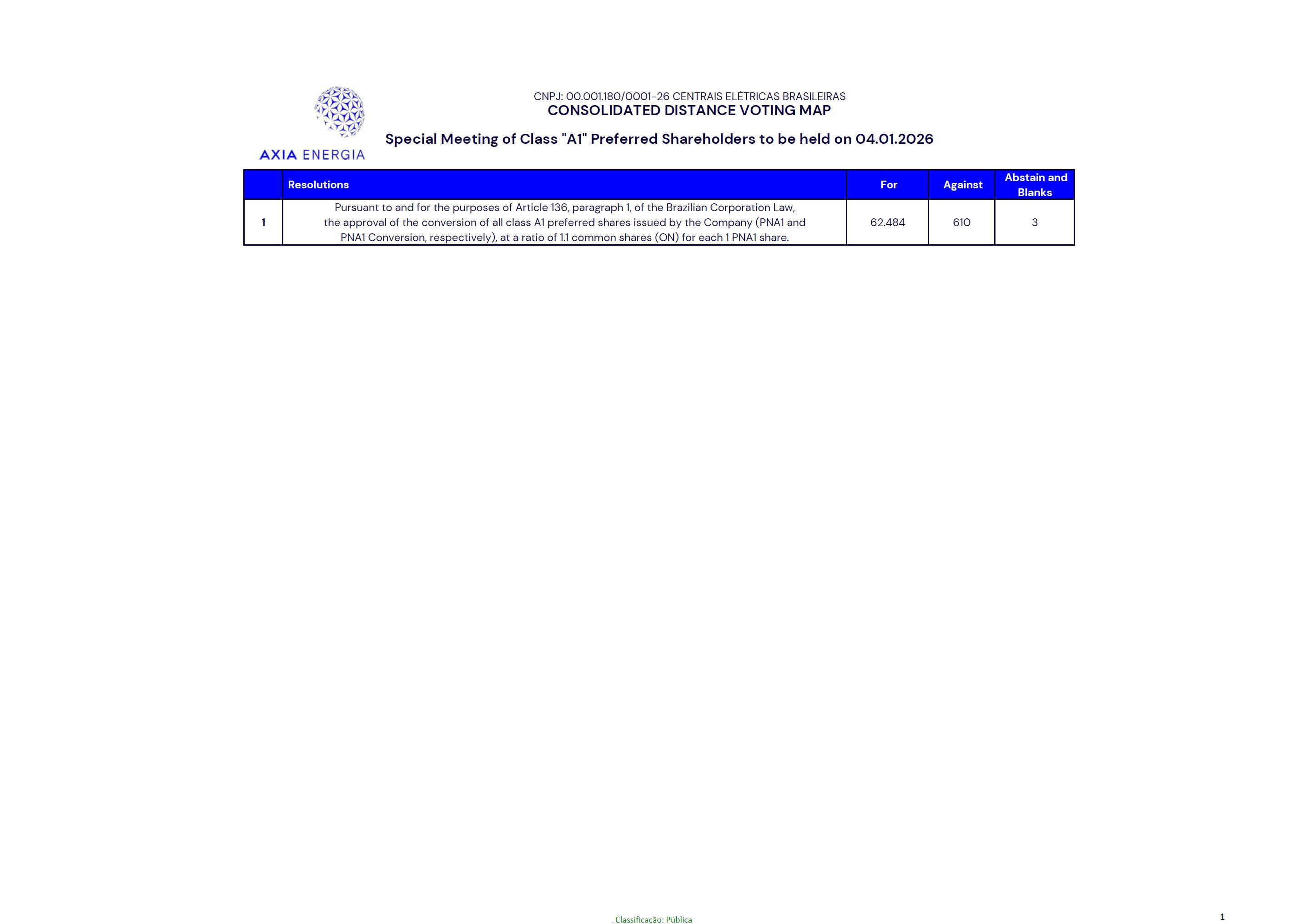 F C Resolutions For Against Abstain and Blanks 1 Pursuant to and for the purposes of Article 136, paragraph 1, of the Brazilian Corporation Law,the approval of the conversion of all class A1 preferred shares issued by the Company (PNA1 andPNA1 Conversion, respectively), at a ratio of 1.1 common shares (ON) for each 1 PNA1 share. 62.484 610 3 CNPJ: 00.001.180/0001-26 CENTRAIS ELÉTRICAS BRASILEIRAS CONSOLIDATED DISTANCE VOTING MAP Special Meeting of Class "A1" Preferred Shareholders to be held on 04.01.2026 # Classificação: Pública 1