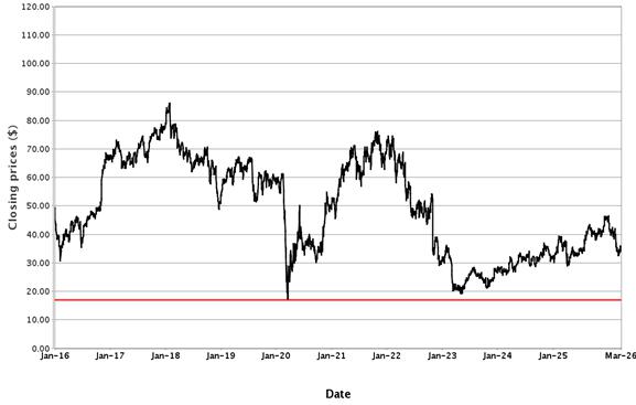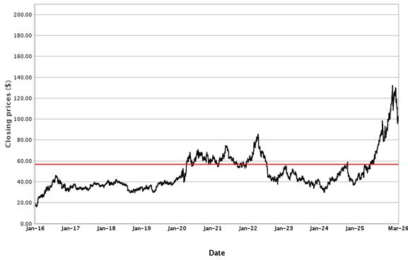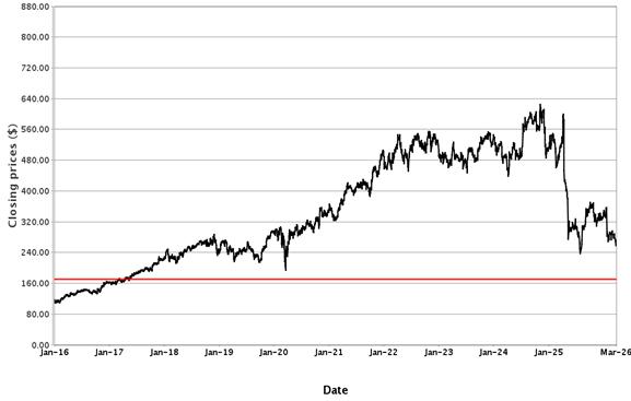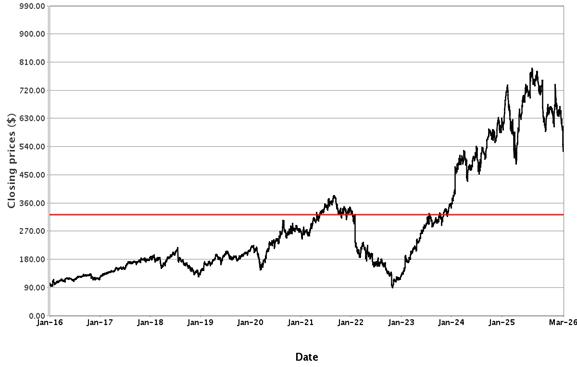The following graphs set forth historical closing values of the Underlier for each offering for the period from January 1, 2016 to March 30, 2026. Each red line represents a hypothetical Coupon Threshold and Barrier Value based on the closing value of the Underlier on March 30, 2026. We obtained the information in the graphs from Bloomberg Financial Markets, without independent investigation. We cannot give you assurance that the performance of the Underlier will result in the return of all of your initial investment.