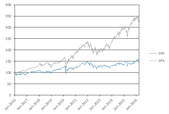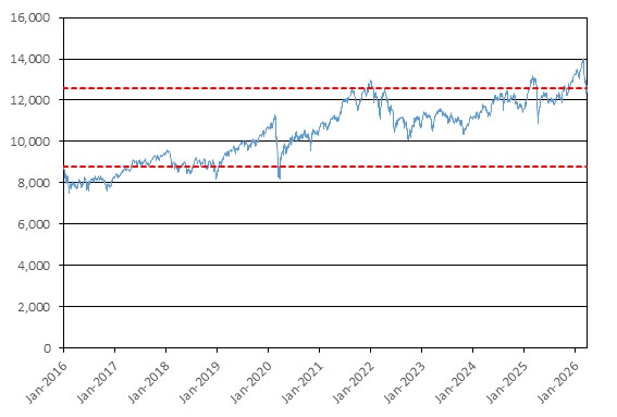 The graph below illustrates the performance of SMI from January 1, 2016 through March 27, 2026, based on the daily closing levels as reported by Bloomberg, without independent verification. UBS has not conducted any independent review or due diligence of any publicly available information obtained from Bloomberg. The closing level of SMI on March 27, 2026 was 12,570.26. The dotted lines respectively represent its call threshold level of 12,570.26, which is equal to 100.00% of its initial level, and its coupon barrier and downside threshold of 8,799.18, which is equal to 70.00% of its initial level. Past performance of the underlying asset is not indicative of the future performance of the underlying asset during the term of the Notes.