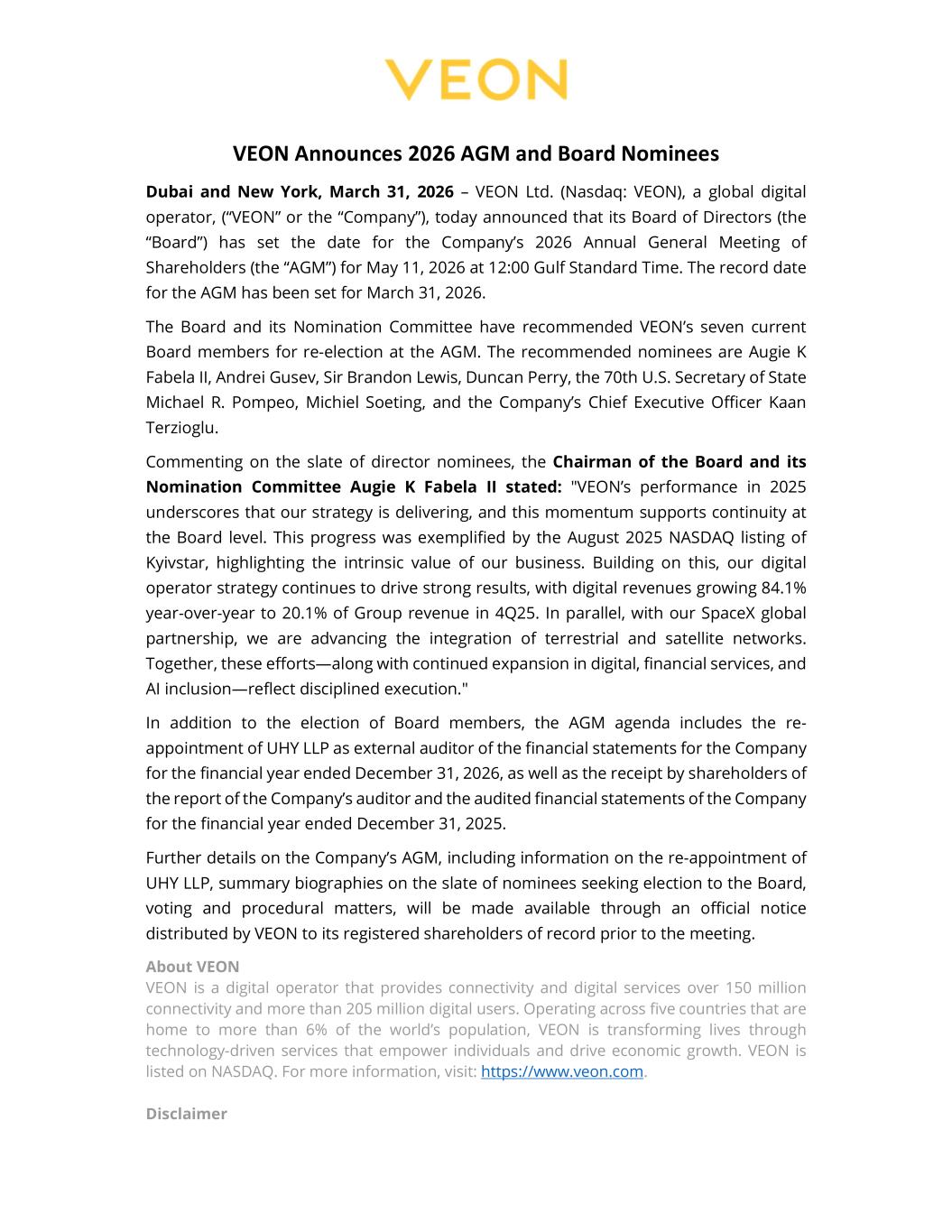VEON Announces 2026 AGM and Board Nominees Dubai and New York, March 31, 2026 – VEON Ltd. (Nasdaq: VEON), a global digital operator, (“VEON” or the “Company”), today announced that its Board of Directors (the “Board”) has set the date for the Company’s 2026 Annual General Meeting of Shareholders (the “AGM”) for May 11, 2026 at 12:00 Gulf Standard Time. The record date for the AGM has been set for March 31, 2026. The Board and its Nomination Committee have recommended VEON’s seven current Board members for re-election at the AGM. The recommended nominees are Augie K Fabela II, Andrei Gusev, Sir Brandon Lewis, Duncan Perry, the 70th U.S. Secretary of State Michael R. Pompeo, Michiel Soeting, and the Company’s Chief Executive Officer Kaan Terzioglu. Commenting on the slate of director nominees, the Chairman of the Board and its Nomination Committee Augie K Fabela II stated: "VEON’s performance in 2025 underscores that our strategy is delivering, and this momentum supports continuity at the Board level. This progress was exemplified by the August 2025 NASDAQ listing of Kyivstar, highlighting the intrinsic value of our business. Building on this, our digital operator strategy continues to drive strong results, with digital revenues growing 84.1% year-over-year to 20.1% of Group revenue in 4Q25. In parallel, with our SpaceX global partnership, we are advancing the integration of terrestrial and satellite networks. Together, these efforts—along with continued expansion in digital, financial services, and AI inclusion—reflect disciplined execution." In addition to the election of Board members, the AGM agenda includes the re- appointment of UHY LLP as external auditor of the financial statements for the Company for the financial year ended December 31, 2026, as well as the receipt by shareholders of the report of the Company’s auditor and the audited financial statements of the Company for the financial year ended December 31, 2025. Further details on the Company’s AGM, including information on the re-appointment of UHY LLP, summary biographies on the slate of nominees seeking election to the Board, voting and procedural matters, will be made available through an official notice distributed by VEON to its registered shareholders of record prior to the meeting. About VEON VEON is a digital operator that provides connectivity and digital services over 150 million connectivity and more than 205 million digital users. Operating across five countries that are home to more than 6% of the world’s population, VEON is transforming lives through technology-driven services that empower individuals and drive economic growth. VEON is listed on NASDAQ. For more information, visit: https://www.veon.com. Disclaimer