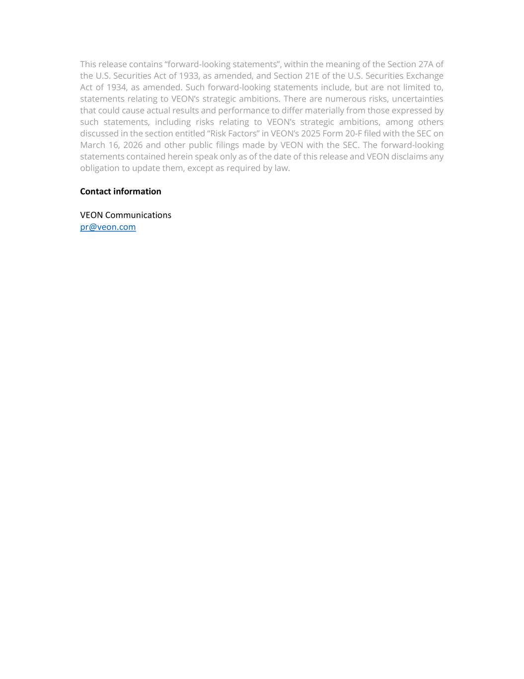 This release contains “forward-looking statements”, within the meaning of the Section 27A of the U.S. Securities Act of 1933, as amended, and Section 21E of the U.S. Securities Exchange Act of 1934, as amended. Such forward-looking statements include, but are not limited to, statements relating to VEON’s strategic ambitions. There are numerous risks, uncertainties that could cause actual results and performance to differ materially from those expressed by such statements, including risks relating to VEON’s strategic ambitions, among others discussed in the section entitled “Risk Factors” in VEON’s 2025 Form 20-F filed with the SEC on March 16, 2026 and other public filings made by VEON with the SEC. The forward-looking statements contained herein speak only as of the date of this release and VEON disclaims any obligation to update them, except as required by law. Contact information VEON Communications pr@veon.com
