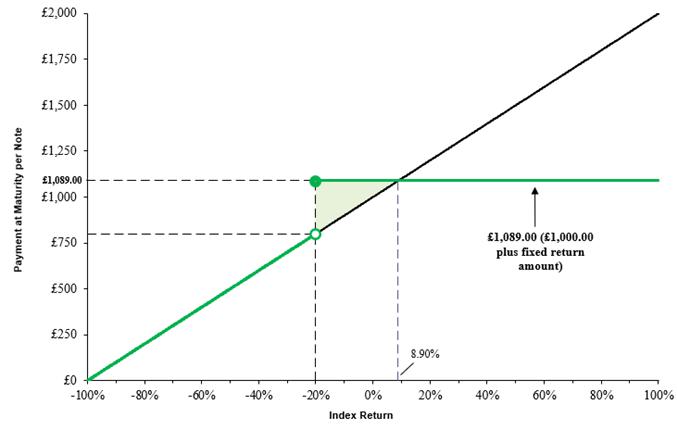 Because the underlying index depreciated from the hypothetical initial index level to the hypothetical final index level by less than 20.00%, your payment at maturity in this scenario would be equal to the £1,000 stated principal amount per security plus the fixed return amount, or £1,089.00 per security.