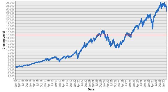 | Nasdaq-100 Index® – Historical Closing Levels* January 4, 2016 to March 27, 2026 |