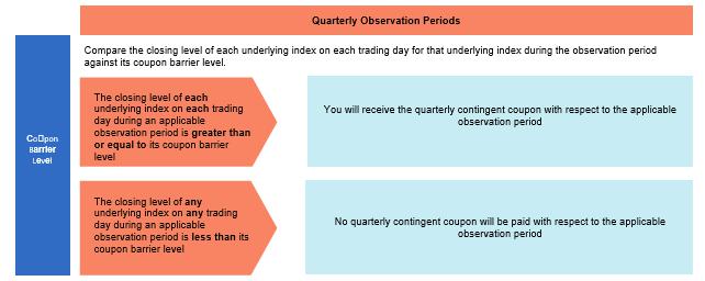 The securities provide an opportunity for investors to earn a quarterly contingent coupon payment, which is an amount equal to $25.875 (2.5875% of the stated principal amount) per security, with respect to each quarterly observation period during which a coupon barrier event does not occur. A coupon barrier event will occur during an observation period if the closing level of any underlying index is less than its coupon barrier level on any trading day for that underlying index during that observation period. The quarterly contingent coupon payment, if any, will be payable quarterly on the relevant contingent coupon payment date, which is the third business day after the related observation period end-date or, in the case of the quarterly contingent coupon payment, if any, with respect to the final observation period, the maturity date. If a coupon barrier event occurs during an observation period, investors will receive no quarterly contingent coupon payment on the related contingent coupon payment date. It is possible that a coupon barrier event will occur with respect to some or all of the observation periods during the term of the securities so that you will receive few or no quarterly contingent coupon payments. We refer to these payments as contingent because there is no guarantee that you will receive a payment on any contingent coupon payment date.