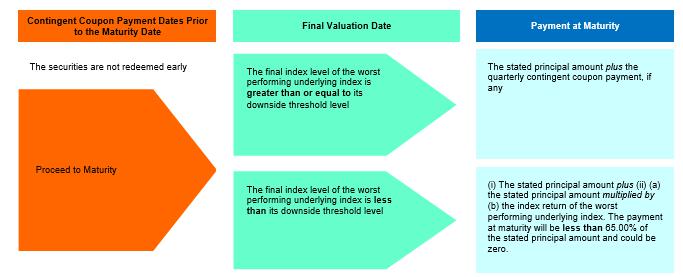 Unless earlier redeemed by us, for each $1,000 stated principal amount security you hold at maturity, you will receive cash in an amount determined as follows (in addition to the final contingent coupon payment, if any): § If the final index level of the worst performing underlying index is greater than or equal to its downside threshold level: $1,000 § If the final index level of the worst performing underlying index is less than its downside threshold level: $1,000 + ($1,000 × the index return of the worst performing underlying index) If the final index level of the worst performing underlying index is less than its downside threshold level, you will receive less, and possibly significantly less, than 65.00% of the stated principal amount of your securities at maturity. |